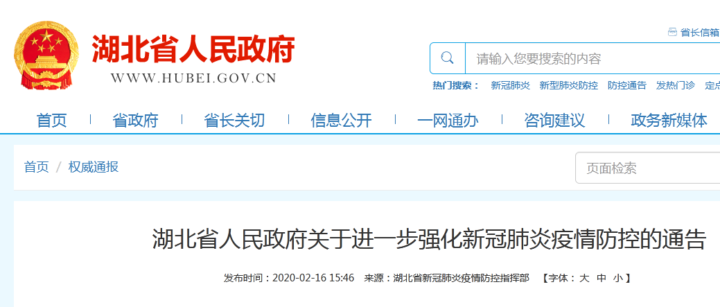 2月16日,湖北发布《湖北省人民政府关于进一步强化新冠肺炎疫情防控的通告》,提出“强化属地防控责任”“强化城乡社区(村)封闭管理”等15个强化要求。
