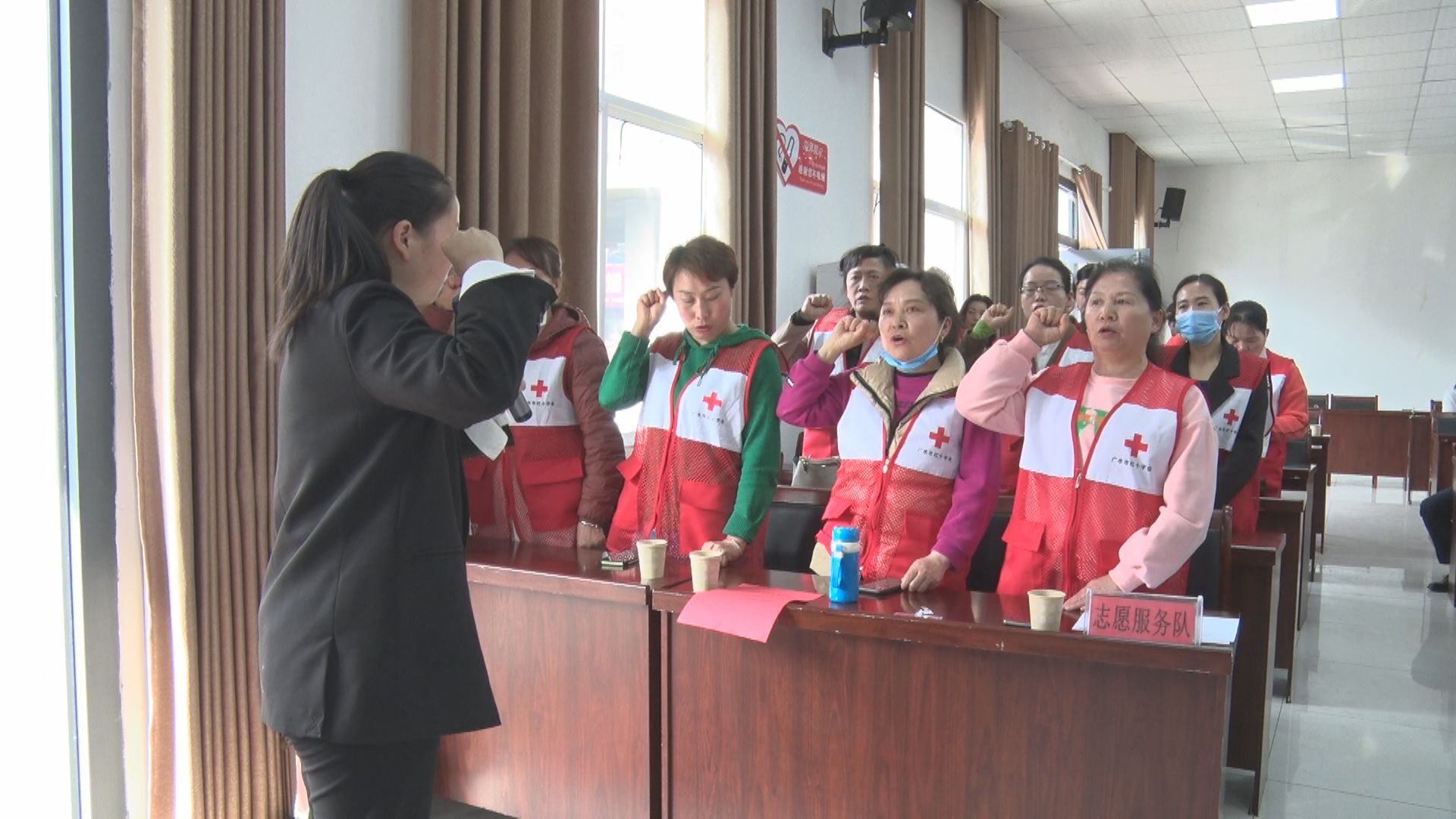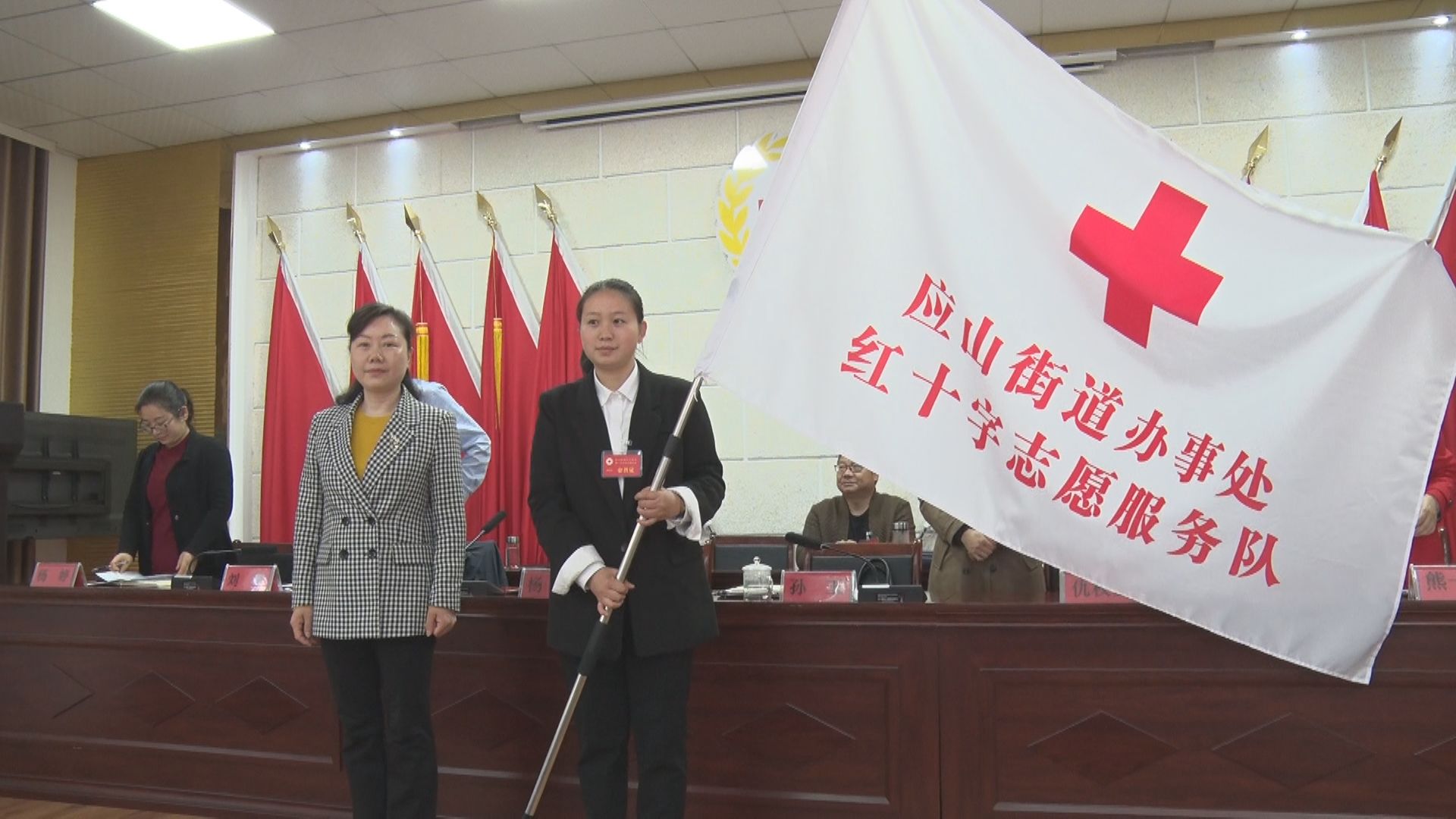 会上,市红十字会负责同志为应山街道红十字志愿服务队授队旗。