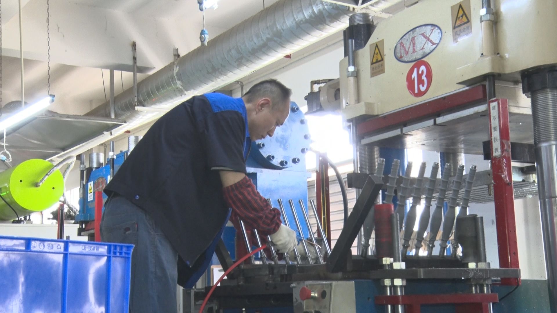 湖北德乐电力生产车间内,一台台生产设备整齐排列,工人师傅正在生产机台上调整参数。随着一系列操作指令的输入,机器高速运转,生产出电力行业所需的制式插拔头。