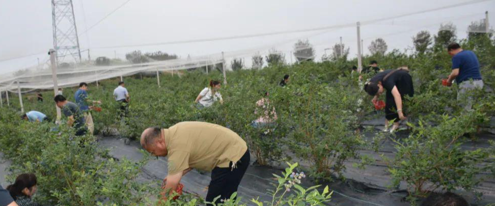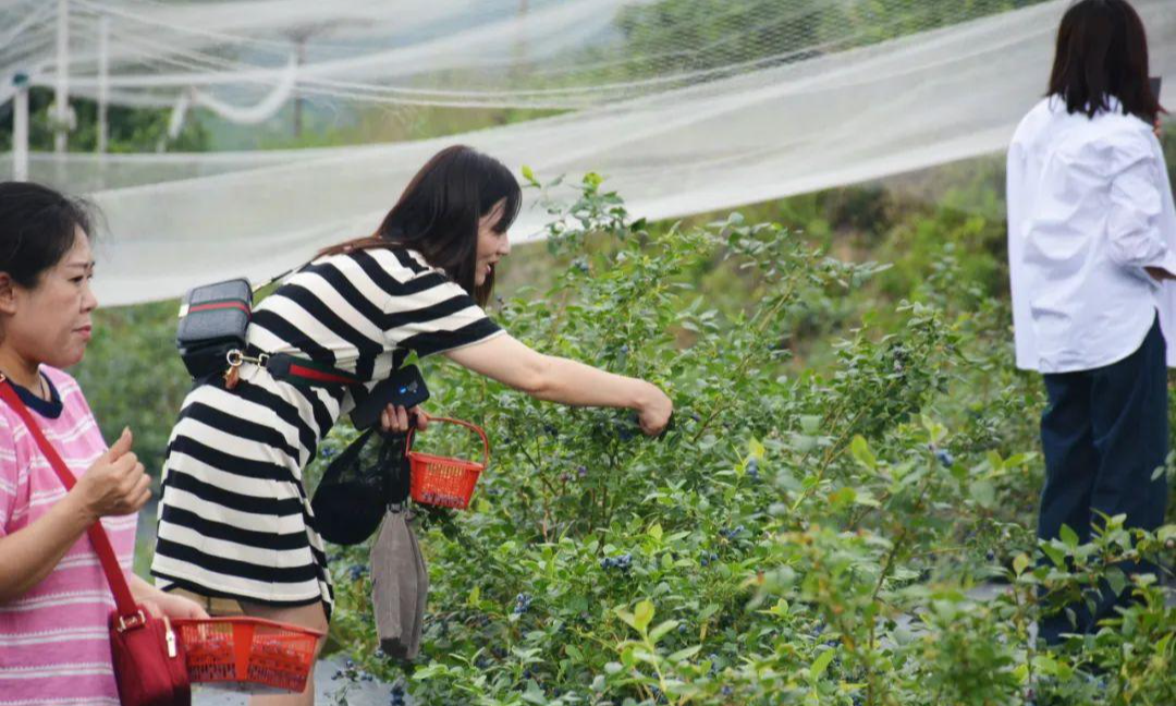 电商直播带货大赛区旁,十里街道观音村300亩蓝莓喜获丰收,成群游客手提果篮穿梭其间、摘果尝鲜,尽享乡村采摘乐趣。