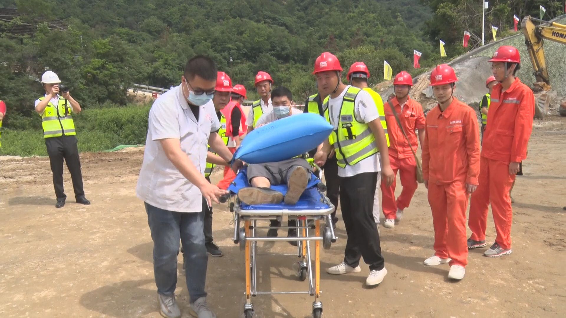 演练模拟湖北随信高速平靖关隧道入口因汛期强降雨,导致施工场地发生泥石流、山体滑坡等地质灾害,造成施工人员受伤被困、边坡坍塌等衍生事故。随信高速项目部应急领导小组迅速启动应急预案,组织应急救援队伍赶赴现场。