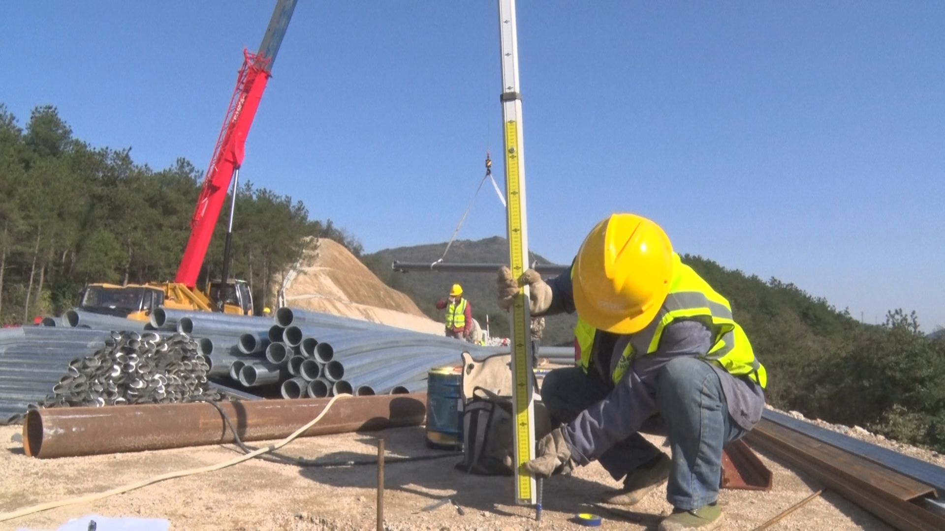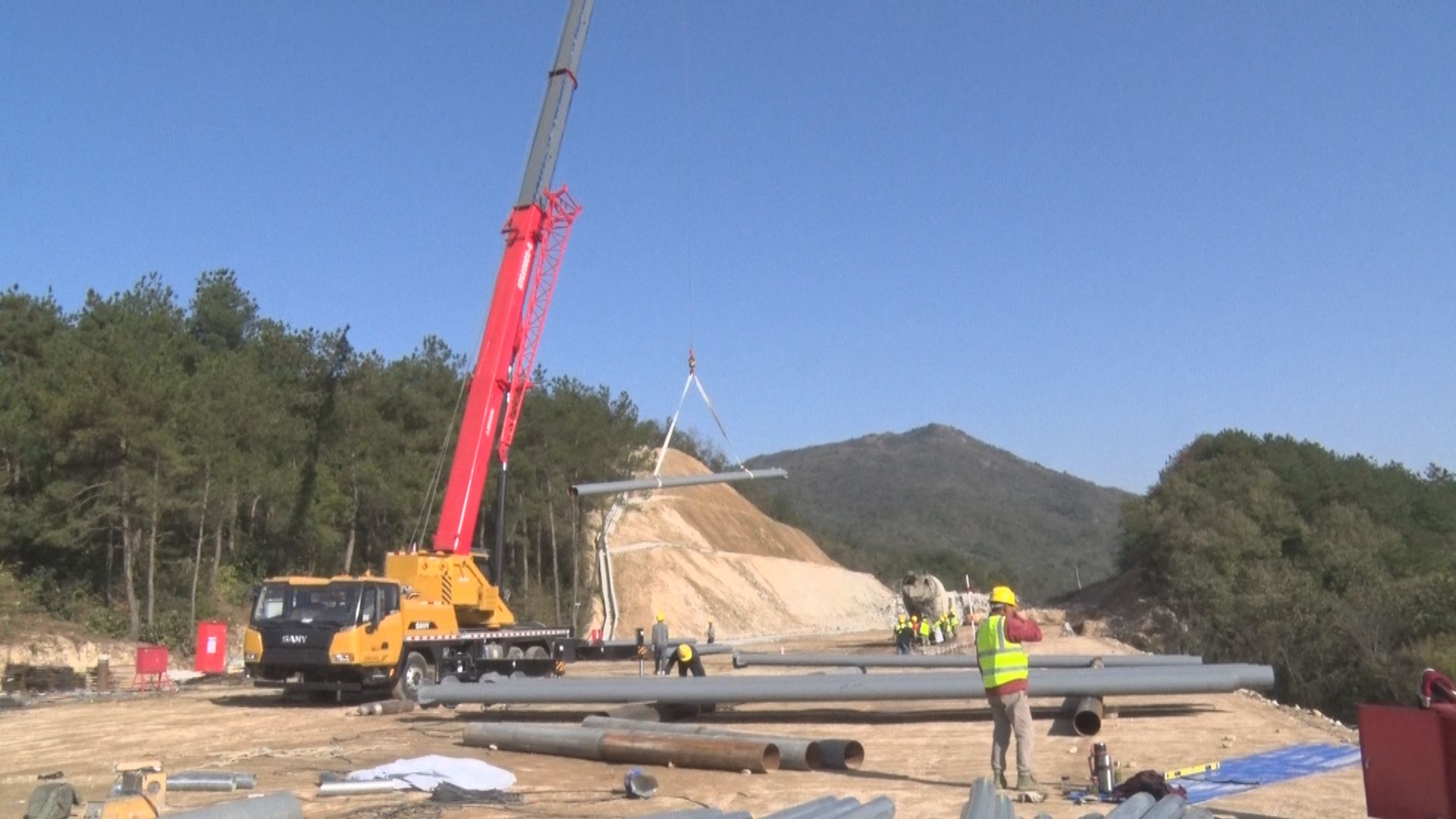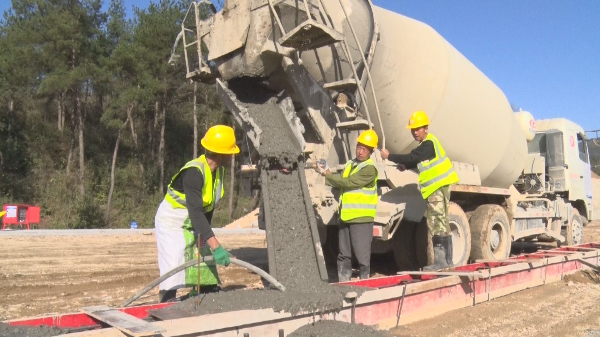 在随信高速第三标段三工区建设现场,施工人员围绕新湾大桥、三潭大桥建设,抢抓时间浇筑龙门吊轨道,推进三号梁场、桩基和桥梁下部构造建设。