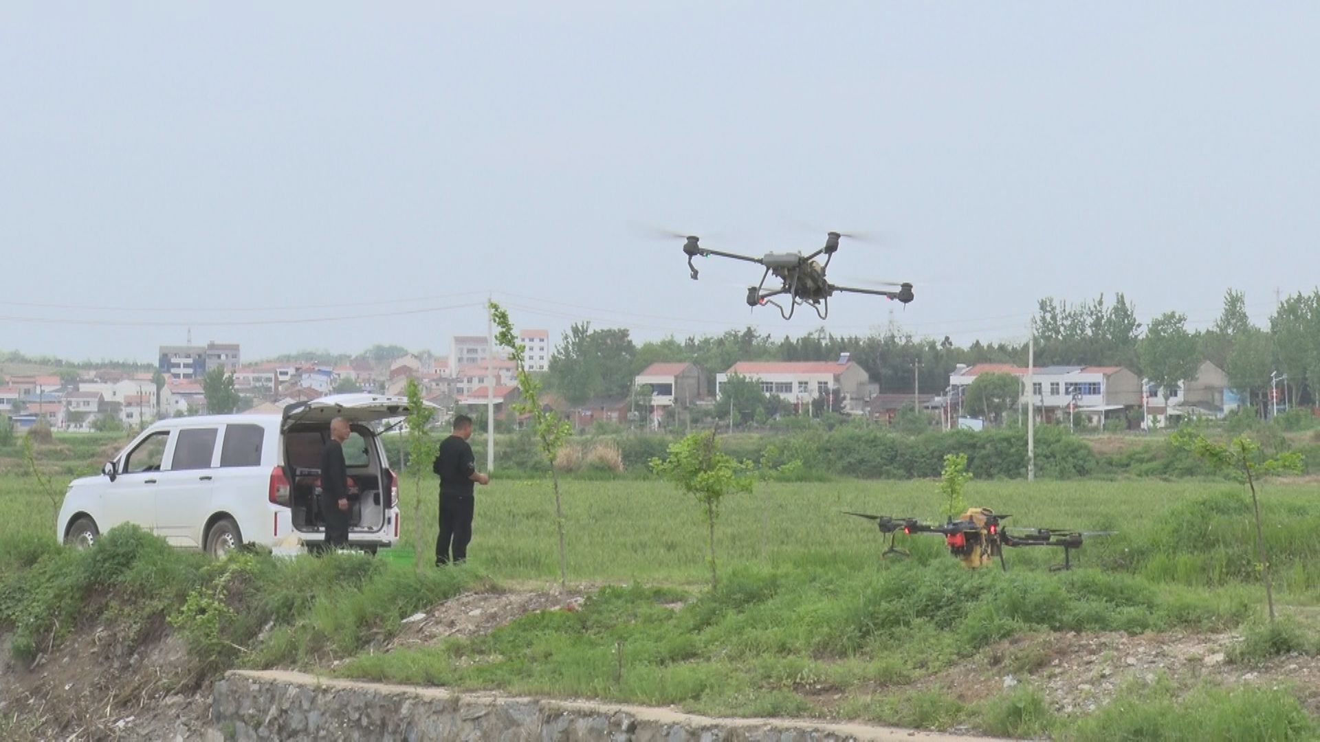 装药、起飞、定位、喷洒……,伴随着一阵阵螺旋桨的嗡鸣声,一架架满载农药的无人机腾空而起,在麦田上空匀速飞行,雾状的农药随着气流均匀地散落在小麦上。