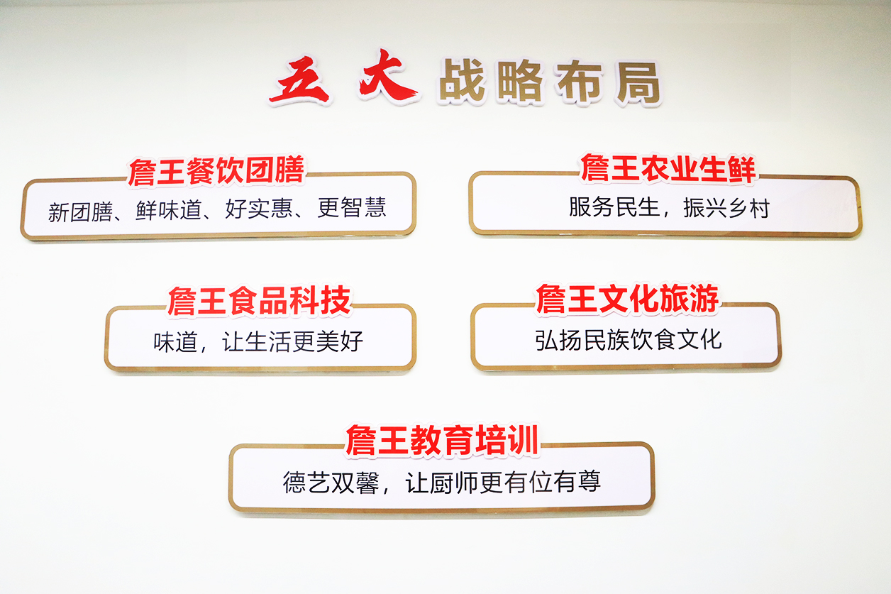 在陈氏詹王公司运营中心,詹王餐饮、农业生鲜、食品科技、文化旅游和教育培训五大战略布局挂于墙面,十分显眼。每个布局下,都标注出相应目标。