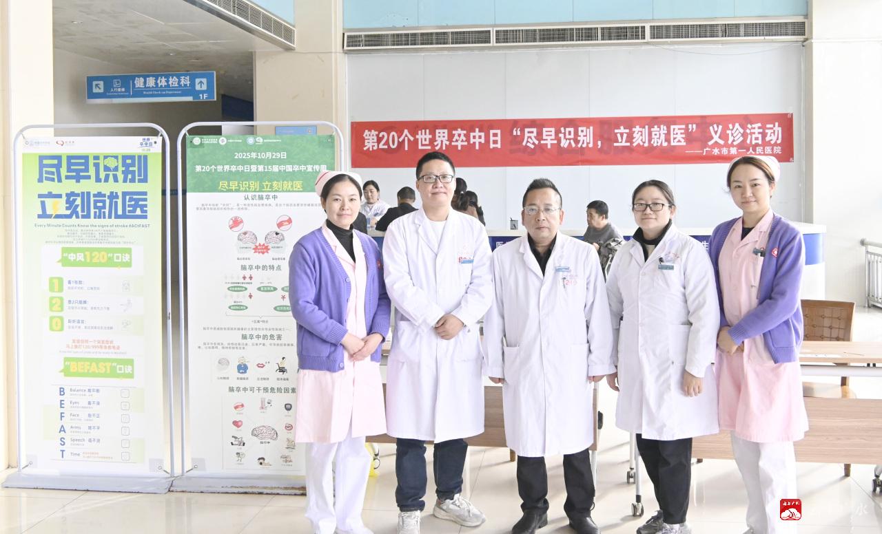 2025年10月29日是第20个“世界卒中日”,今年的宣传主题是“尽早识别,立刻就医”。为切实提高市民对脑卒中防治知识的知晓率,倡导健康生活方式,广水一医院神经内科医护专家团队于当日在医院门诊大厅开展健康宣教义诊活动。