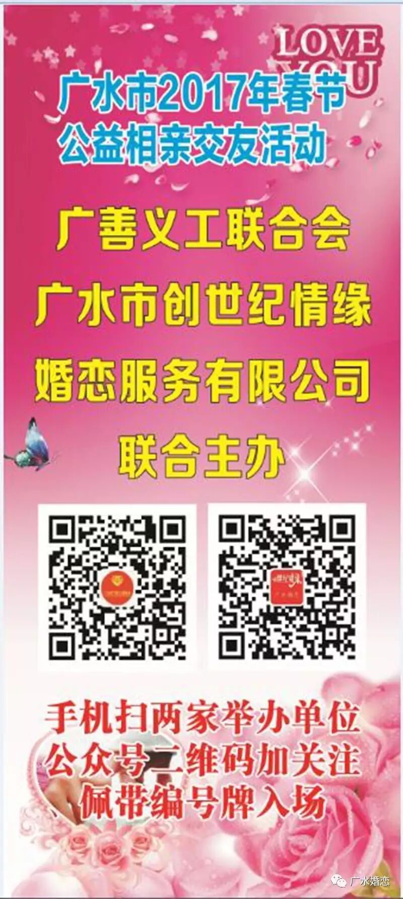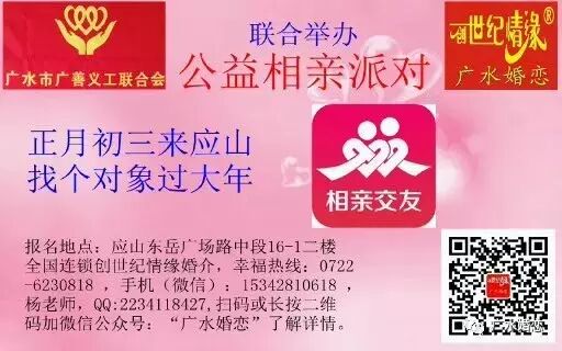 为了给我市单身人士提供一个利用春节假期集中相亲交友机会,广善义工联合会联合广水市创世纪情缘婚恋服务有限公司,定于2017年1月30日(正月初三)14:00至17:00在应山城区某酒店KTV举办春节单身交友派对。