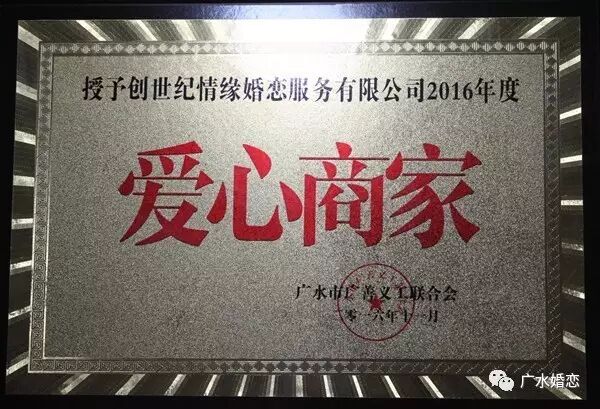 广水市创世纪情缘婚恋服务有限公司(全国连锁创世纪情缘婚恋广水店)是广善义工联合会授予的“爱心商家”,长期专注于广水市婚恋服务行业。