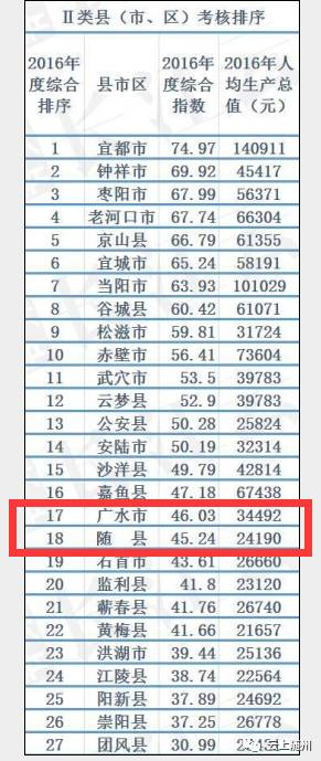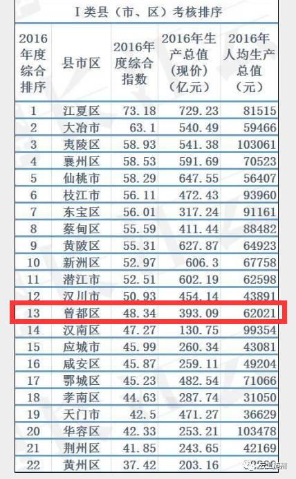 Ⅰ类县(市、区)主要是武汉、宜昌、襄阳、荆州、荆门、黄冈、随州等大中城市的市辖区、黄石和孝感等市周边县(市)以及省直管市,交通区位优势明显,经济基础较好。2016年Ⅰ类县(市、区)实现生产总值9152.38亿元,有15个区市GDP过300亿元,8个过500亿元,其中,江夏区、仙桃市、黄陂区、新洲区、潜江市过600亿元。随州市的曾都区位列Ⅰ类考核的第13位,2016年曾都区GDP总量达到393.09亿元,人均GDP达到62021元。