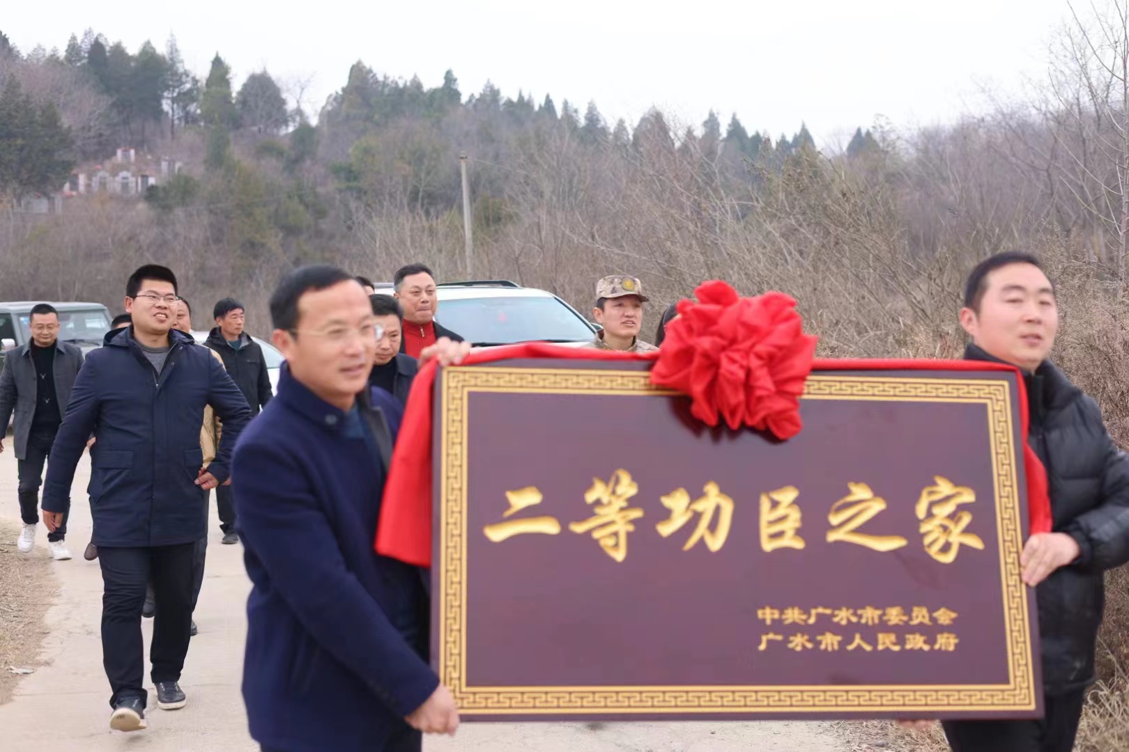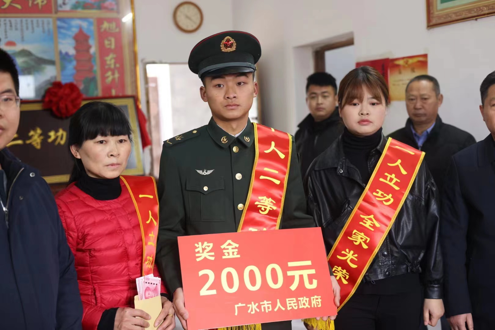 市人武部、市退役军人事务局负责同志来到聂店村下仇家畈湾共同为荣立个人二等功的军人朱玉美家庭送去二等功臣之家牌匾、立功喜报和奖励金,并送上党委政府的祝贺与关怀,营造“参军光荣、立功光荣”的良好氛围。