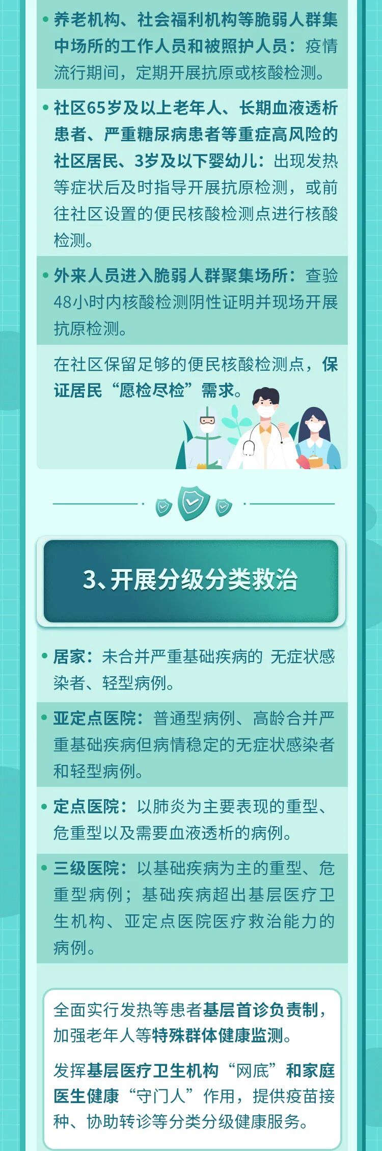 当前,我们需将工作重心从防控感染转到医疗救治上来,工作目标是保健康、防重症,确保防控措施调整转段平稳有序。特别需要关注老年人、有基础性疾病人群等重症高风险人群的疫苗接种、个人防护和感染后的及时救治,最大限度减少重症和病亡。