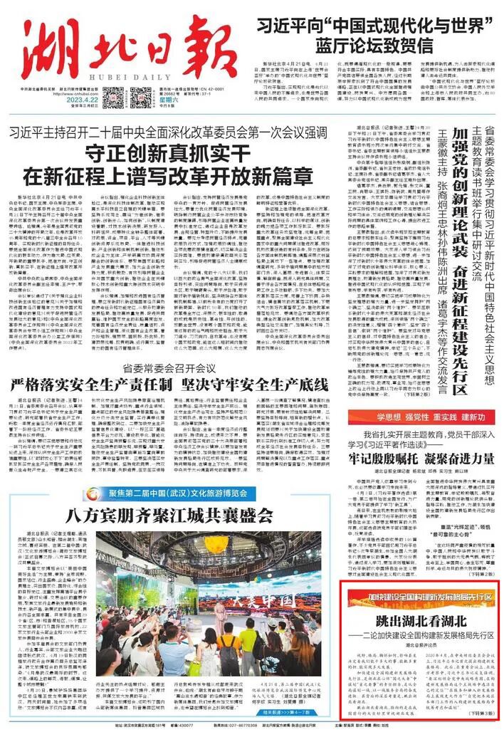 跳出湖北看湖北,指向的是在我国前行的大坐标里审视湖北发展。2020年4月,在中央财经委员会会议上,习近平总书记首次提出构建新发展格局。此后,在重要会议上,在地方考察中,习近平总书记反复强调,“要深刻领会党中央战略意图,在构建新发展格局这个主战场中选准自己的定位”“在服务和融入新发展格局上展现更大作为”“自觉把本地区本部门工作纳入构建新发展格局中统筹考虑和谋划”。湖北加快建设全国构建新发展格局先行区,体现的是一种大局意识和全局观念。一方面,这包含“登高望远”的视野打开:加快构建新发展格局,是把握未来发展主动权的战略举措,是推动高质量发展的战略基点。一方面,这彰显“脚踏实地”的坚定前行:加快先行区建设,是将国家所需、湖北所能、群众所盼、未来所向有机结合起来的一条光明大道,是谋定而后动的积极作为。