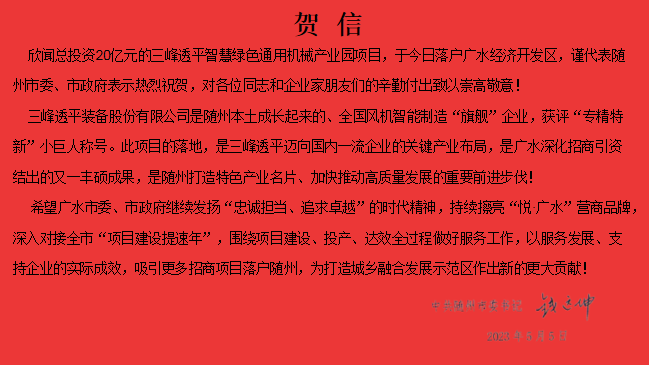 随州市委书记钱远坤为项目签约发来贺信:欣闻总投资20亿元的三峰透平智慧绿色通用机械产业园项目落户广水经济开发区,谨代表随州市委、市政府表示热烈祝贺,对各位同志和企业家朋友们的辛勤付出致以崇高敬意!三峰透平装备股份有限公司是随州本土成长起来的、全国风机智能制造“旗舰”企业,获评“专精特新”小巨人称号。此项目的落地,是三峰透平迈向国内一流企业的关键产业布局,是广水深化招商引资结出的又一丰硕成果,是随州打造特色产业名片、加快推动高质量发展的重要前进步伐!希望广水市委、市政府继续发扬“忠诚担当、追求卓越”的时代精神,持续擦亮“悦·广水”营商品牌,深入对接全市“项目建设提速年”,围绕项目建设、投产、达效全过程做好服务工作,以服务发展、支持企业的实际成效,吸引更多招商项目落户随州,为打造城乡融合发展示范区作出新的更大贡献!