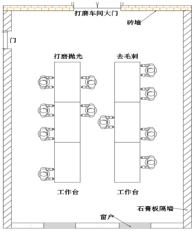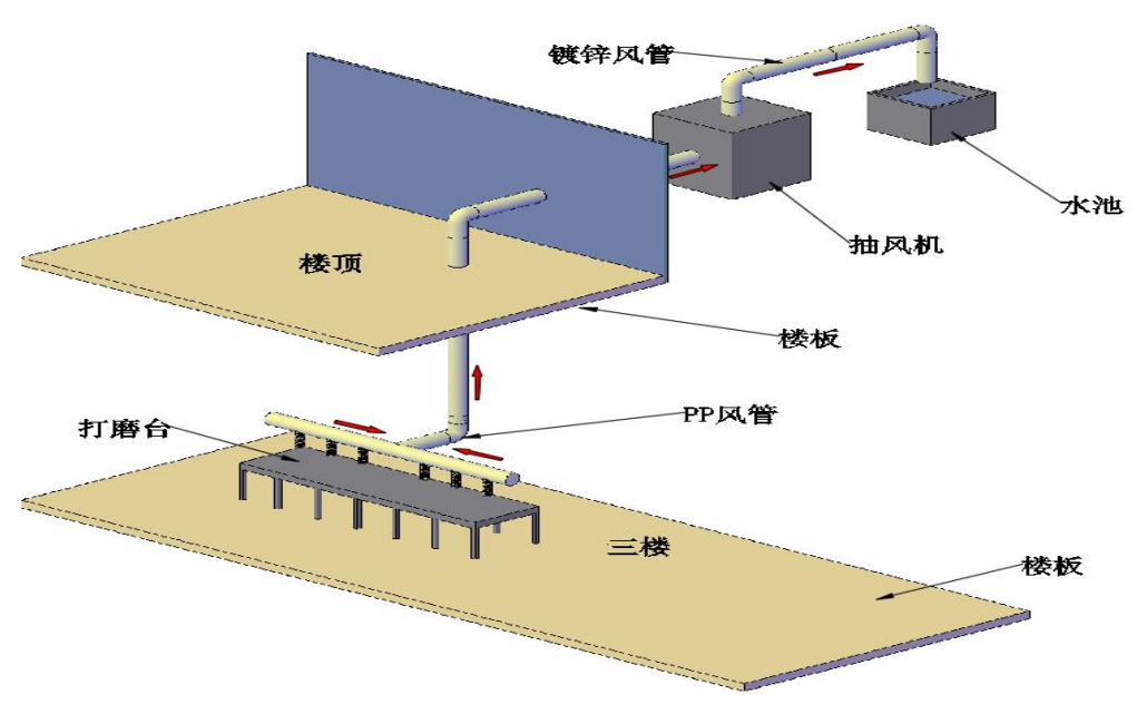 作业人员均采用气动工具进行打磨作业,产生的粉尘通过PU聚氨酯软管吸入上方PP主风管,主风管道穿越楼板连接到楼顶风机,风机将粉尘正压直接吹入水池中。