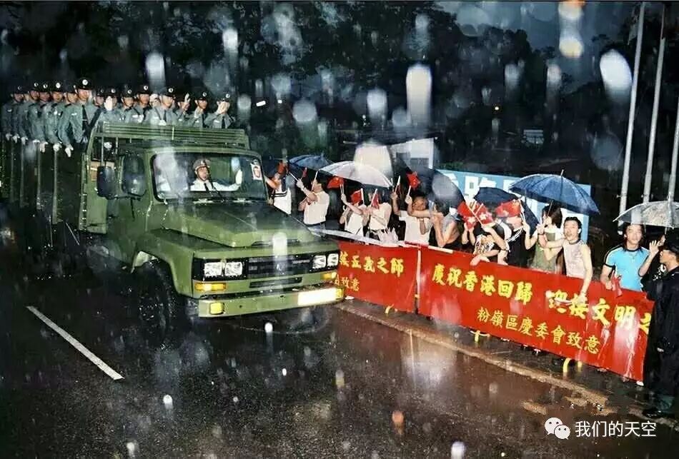 1997年7月1日零时尽管大雨如注,中国人民解放军驻港部队三军官兵依然准时准点从陆地、空中、海上同时进驻香港。