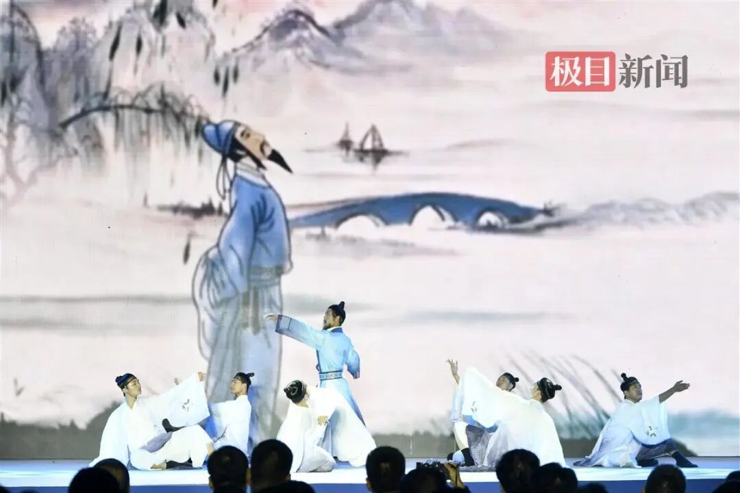 而李白月下小酌后诗兴大发的身影,当晚也跃然台上——墨舞《水墨丹青》的诗意演绎里,国家一级演员肖雪峰扮演的“李白”一抬腕,一滴墨便在舞台上晕染开来,随着他的动作,这滴墨飞舞成遒劲有力的笔画和汉字,那些曾从李白笔尖奔涌而出的佳句也在舞台大屏幕上纷至沓来,诗人愁苦时的“举杯消愁愁更愁”,喜悦时的“轻舟已过万重山”,狂放时的“千金散尽还复来”,都在墨中,尽在舞里。