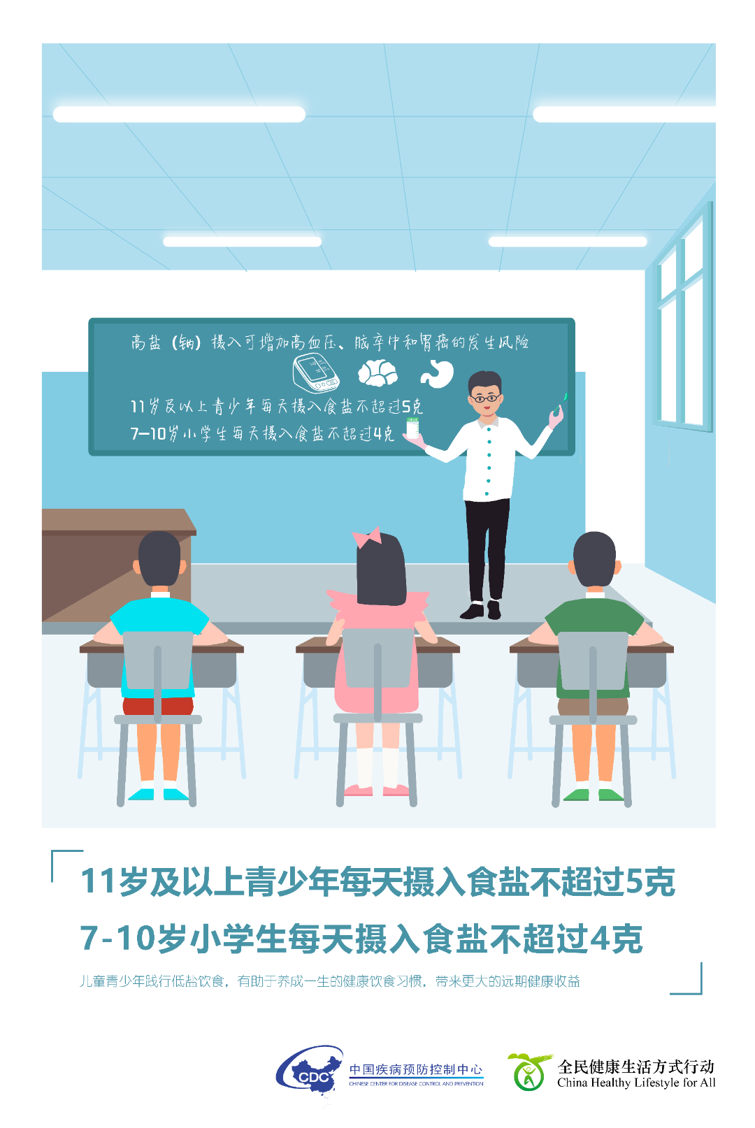 11岁及以上青少年每天摄入食盐不超过5克;7-10岁小学生每天摄入食盐不超过4克。