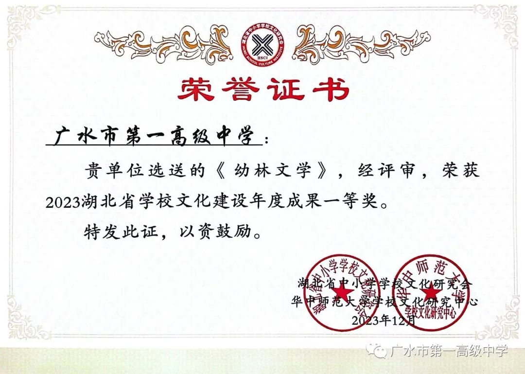 近日,从湖北省第十四届校园文化论坛传来捷报,广水市一中获评“湖北省中小学社团活动创新先进单位”,该校幼林文学社和校艺术团也均获“2023湖北省优秀学生社团”的荣誉,该校《幼林文学》期刊更是在湖北省学校文化建设年度成果评比中荣获一等奖。