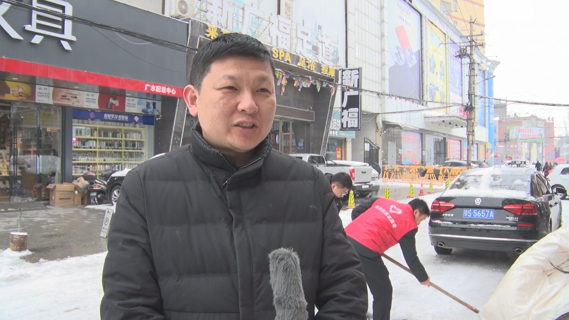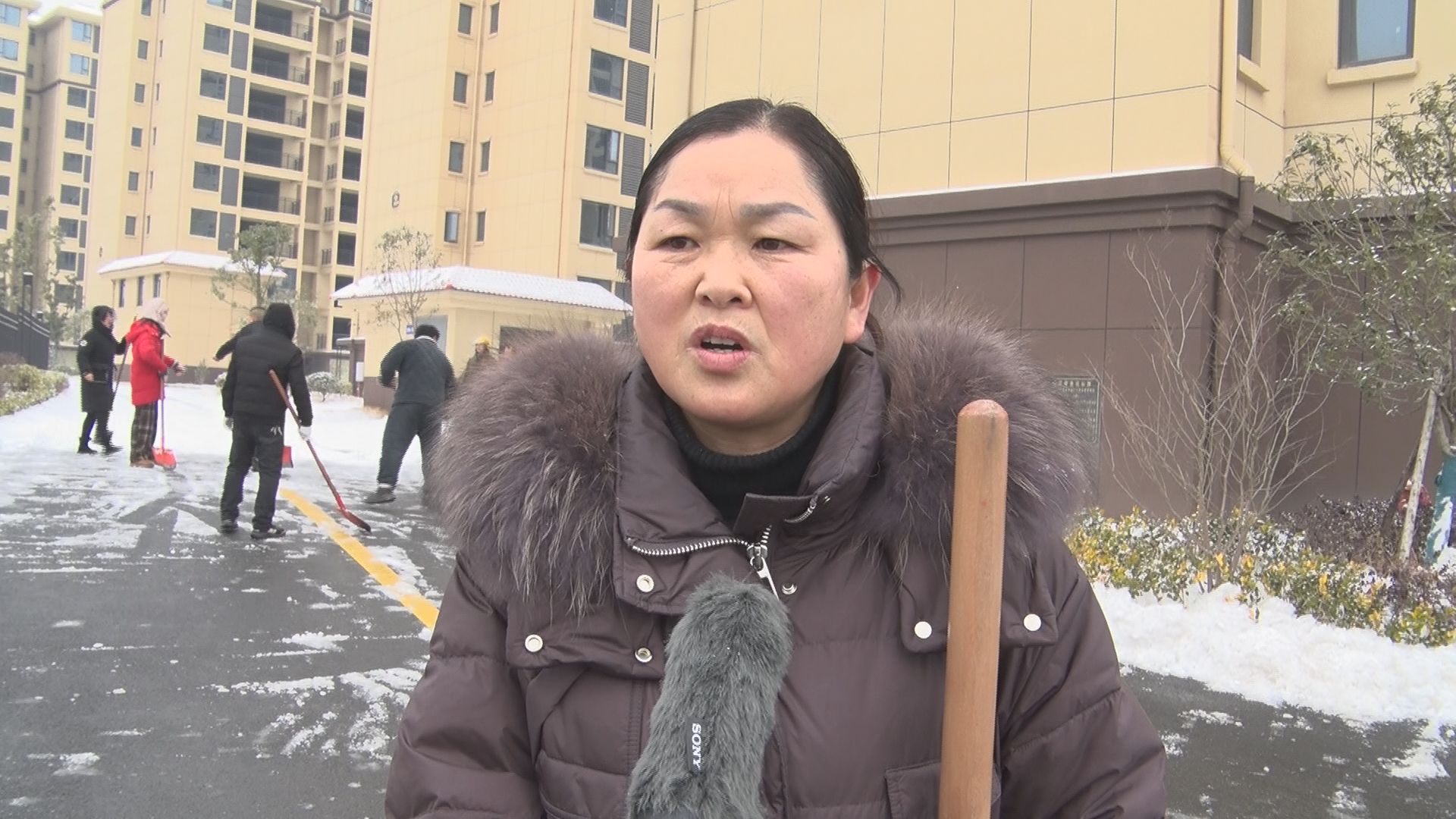 志愿者、西亚丽宝公司行政经理 王潇:“今天大雪天气,我们西亚公司也积极响应政府和社区的号召,对路边的积雪进行铲除,方便居民出行。今天上午也有居民的小轿车,因为打滑不能启动,然后我们和社区的同志一起,对车轮下面的雪进行铲除。”