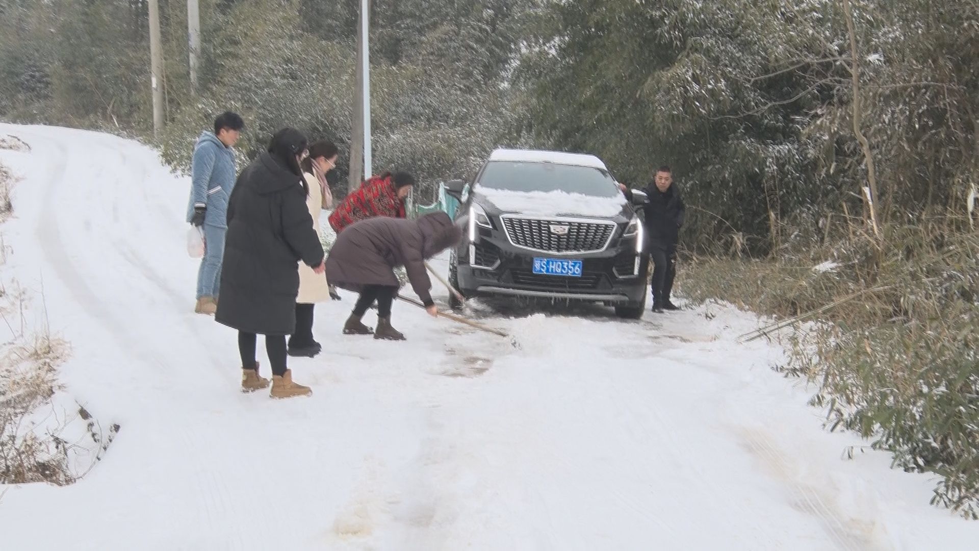 志愿者们上前“破冰突围”、铲除积雪,大家齐心协力伸出援手,帮助车辆成功脱困。