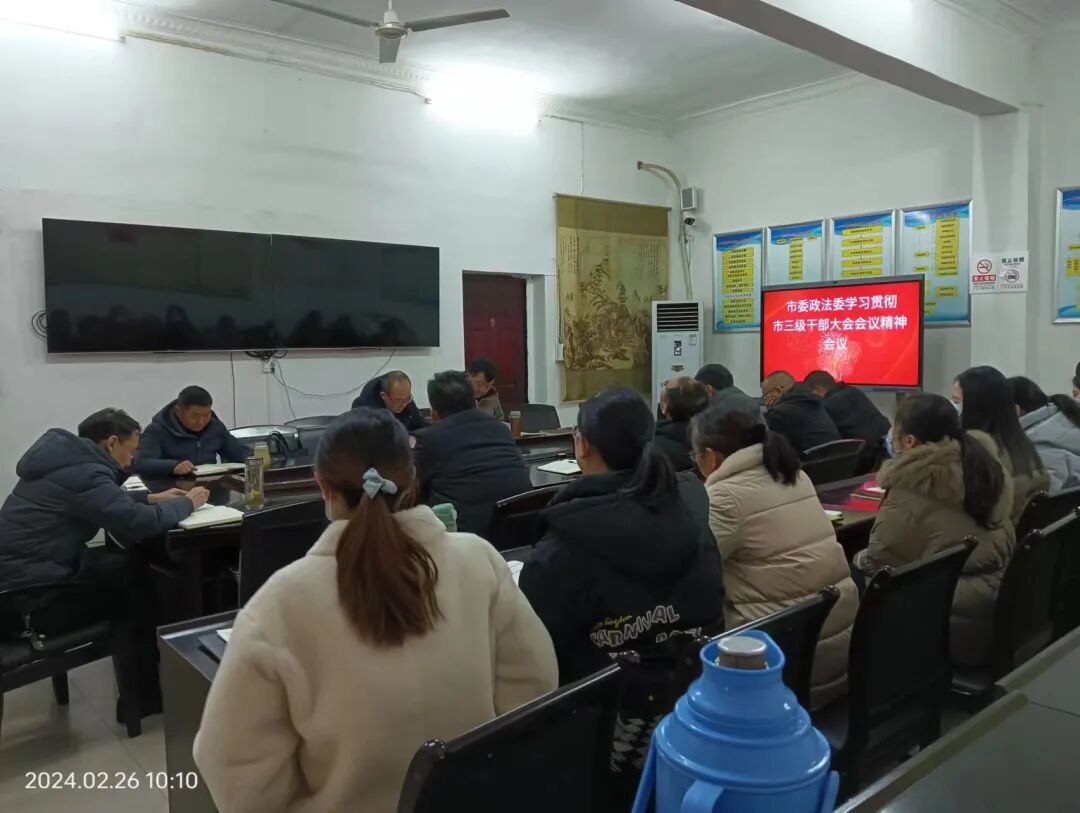 全市三级干部大会召开后,市委政法委机关第一时间召开会议,认真学习传达贯彻落实。