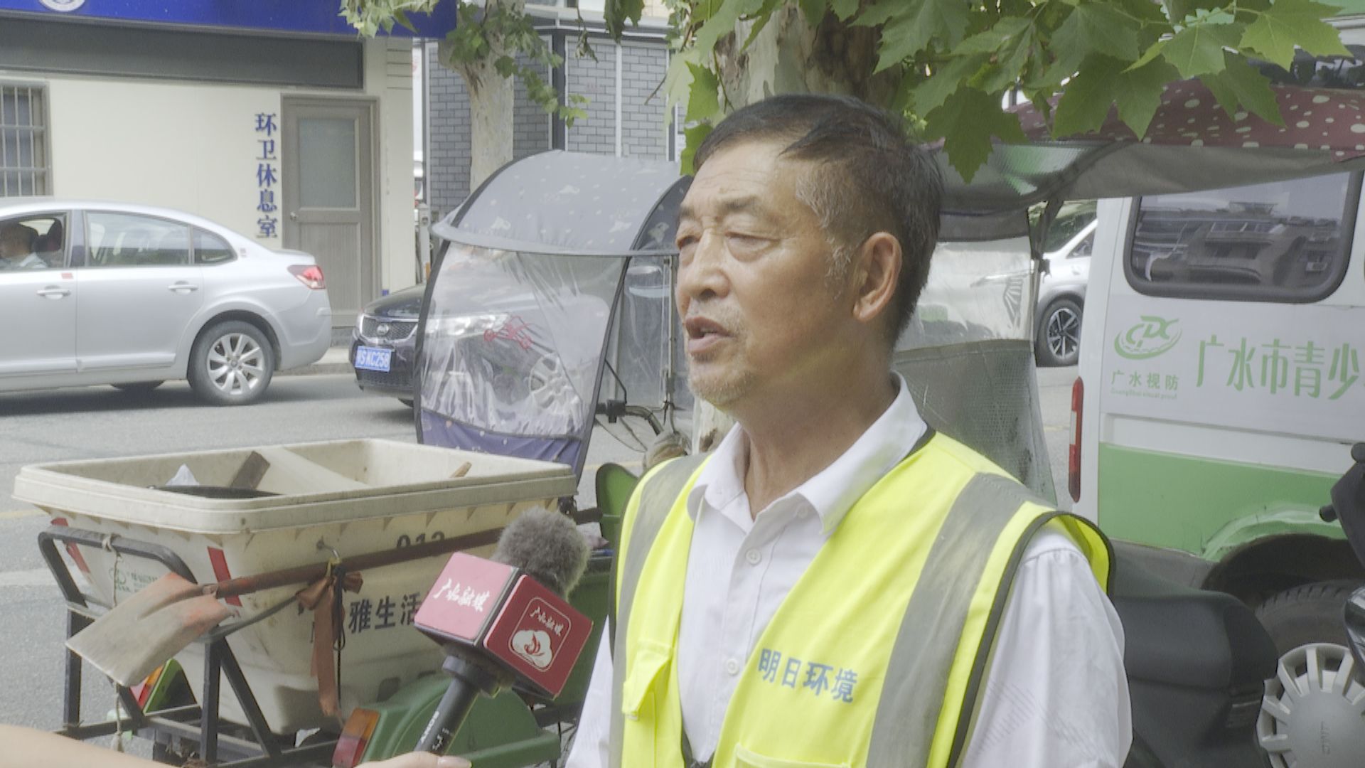 环卫工人:“冰箱很方便,口渴了就来拿水,很好、很方便。”
