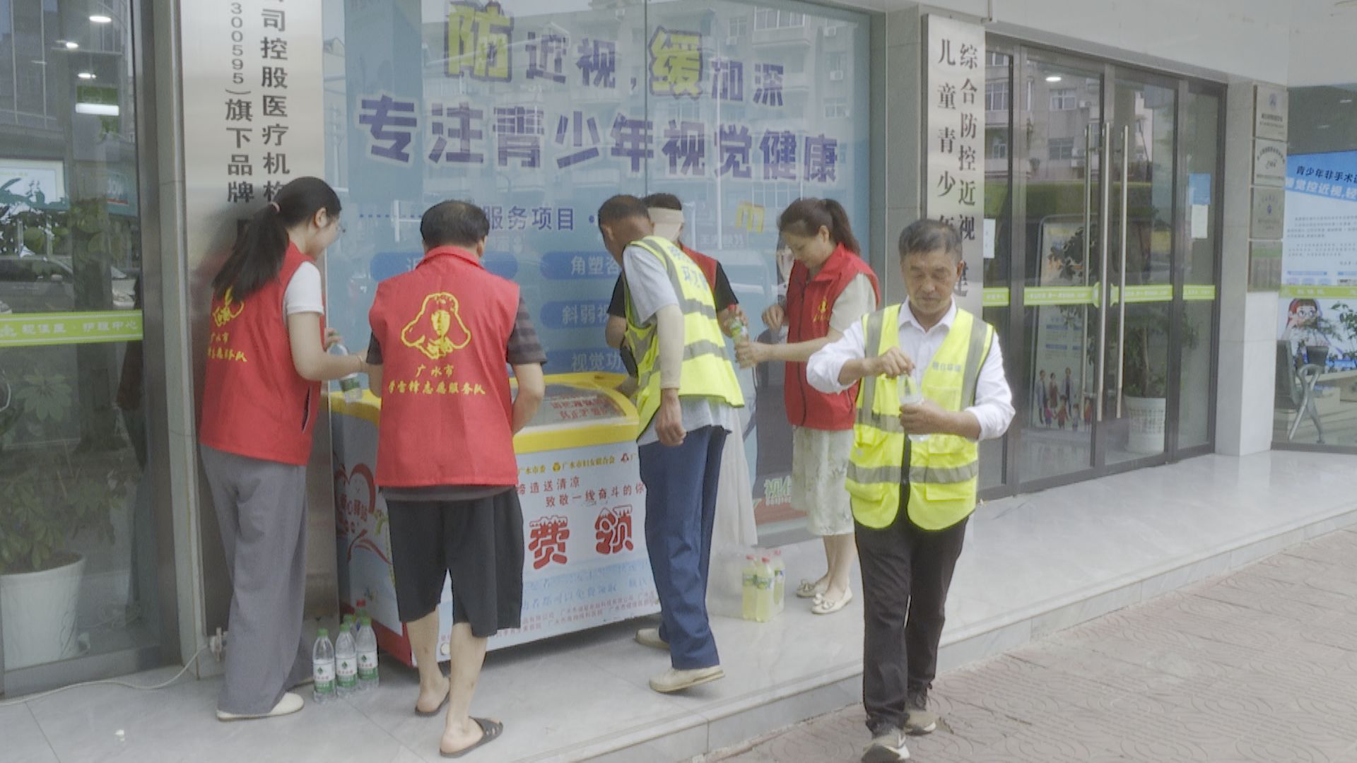 8月15日,在应山街道广安路视佳医眼科店门口,不时有户外工作者从“爱心冰柜”里取水解暑降温。