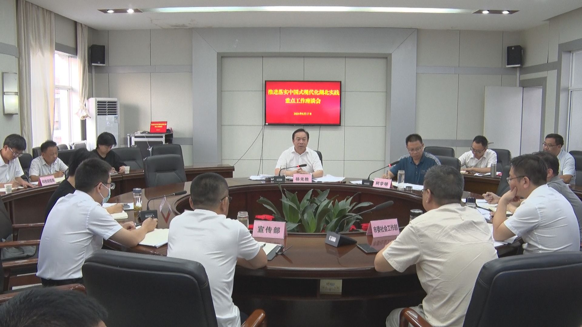 8月17日,市委召开推进落实中国式现代化湖北实践重点工作座谈会。市委书记杨光胜强调,要深入学习贯彻党的二十届三中全会精神,学习贯彻习近平总书记关于中国式现代化的重要论述,全面对接湖北建成支点“五个功能定位”,积极落实“五个以”实践体系框架和“五个一”省级发展调控机制,统筹谋划、纵深推进各领域改革,持续升腾“五干”气场,集聚“广水不贰、笃进百强”强劲动能,以更高站位、更实举措,推动中国式现代化湖北实践工作部署在广水走深走实。