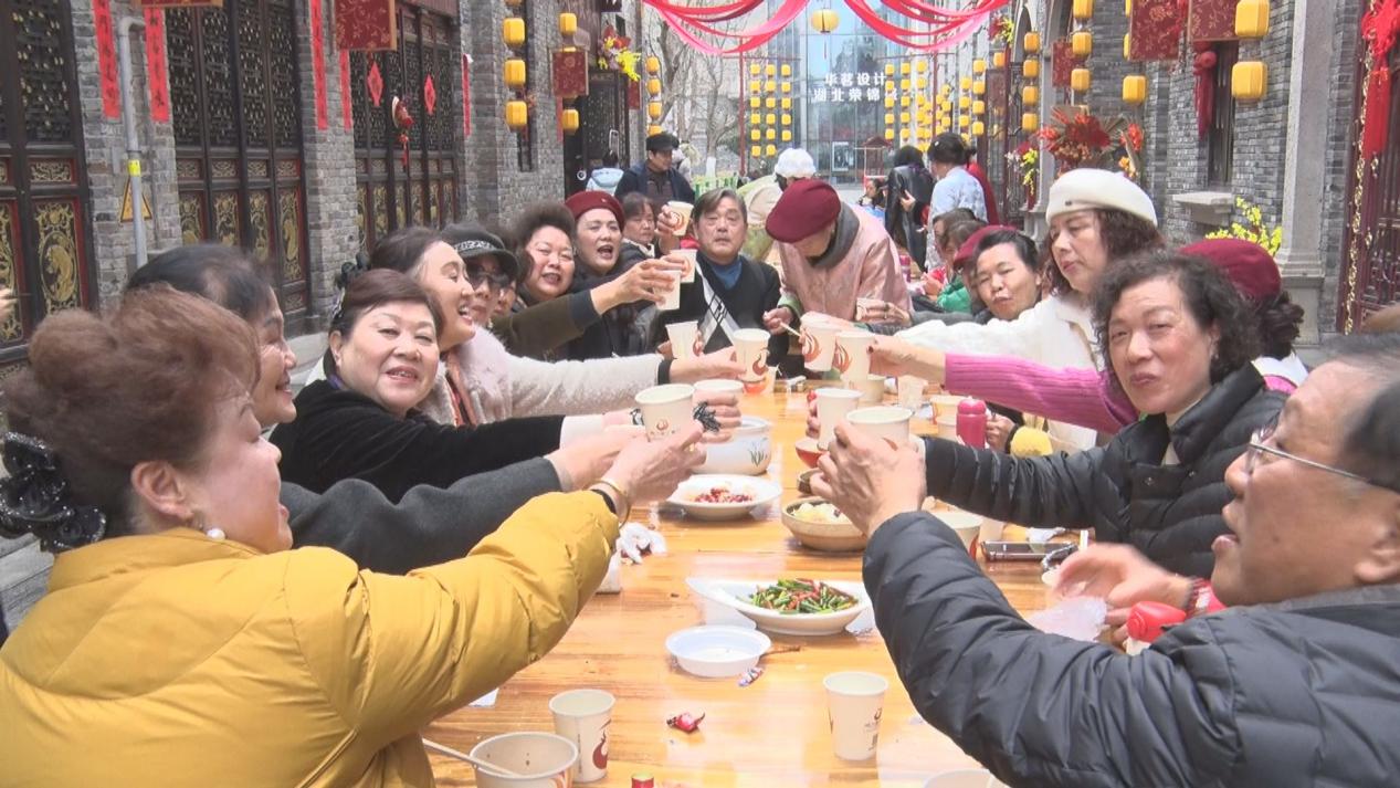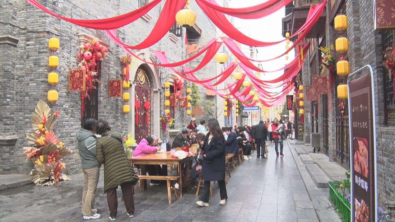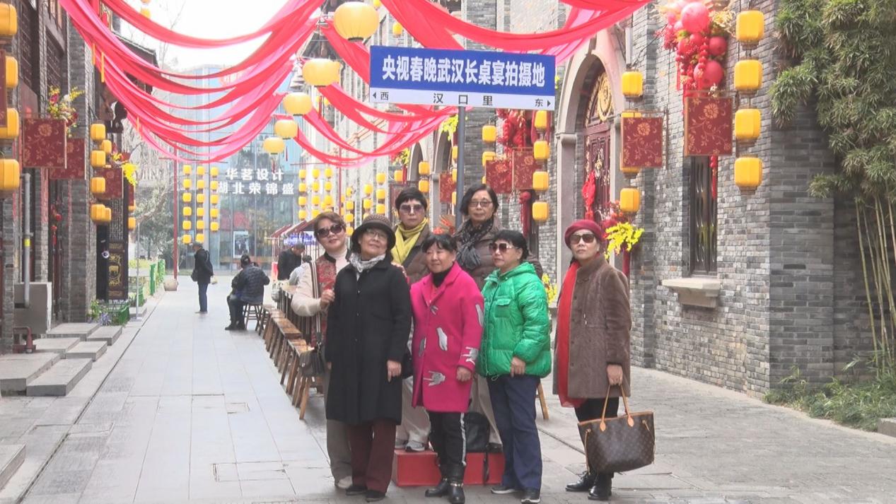 2月19日,武汉汉口里“央视春晚长桌宴拍摄地”人潮涌动,众多游客纷纷前往打卡,在长桌上用餐,沉浸式体验“春晚同款”地标带来的乐趣。