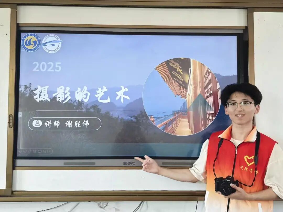 课程开始前,志愿服务队结合学生特点,精心准备了摄影器材、教学课件和作品示例,为课程顺利开展打下坚实基础。志愿者谢胜伟以摄影基础概念引入,通过九宫格、对角线等构图技巧的讲解,搭配人像、风光、静物等实例分析,点燃了学生们的学习热情。