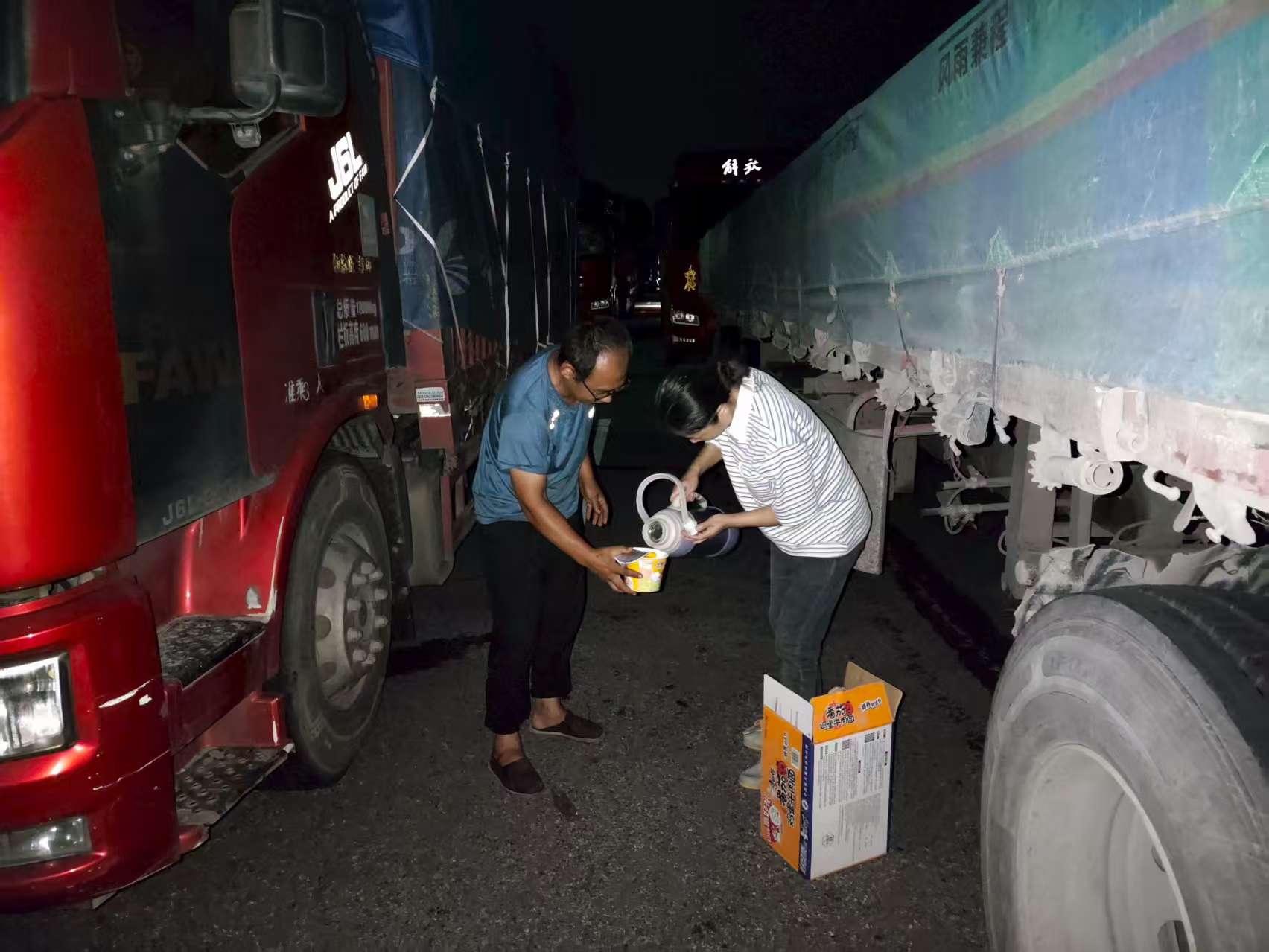 “堵了好几个小时,又累又饿,没想到有这么多人来给我们送食物和水,真的太感动了!”,滞留司机捧着热气腾腾的泡面,感动地说。