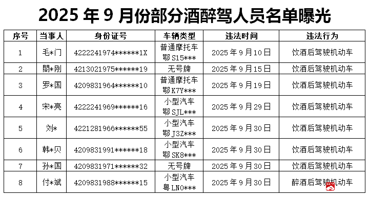 【交警曝光台】2025年9月份部分酒醉驾人员名单曝光