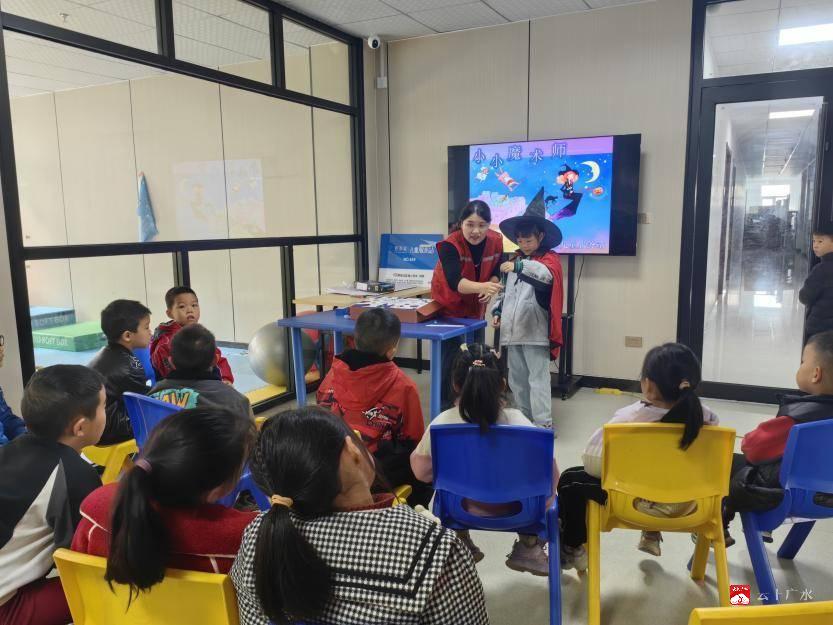 伴随着欢快音乐声响起,在孩子们期待的目光中,魔术表演准时开始。义工老师化身“魔术师”轻轻一挥,空手中变成了一条红丝巾;“魔法书”、“读心术”、“消失的小球”、“隔空转移硬币”等精彩节目轮番上阵,孩子们目不转睛地观看着“魔术师”精彩绝伦的表演,幽默风趣的互动游戏逗得孩子们哈哈大笑,为孩子们展示了一个又一个“奇迹时刻”。“魔术师”精彩的表演、神奇的道具,深深吸引了孩子们的眼球,令所有孩子兴奋不已,不时发出一阵阵欢呼声,孩子们一个劲儿给鼓掌。