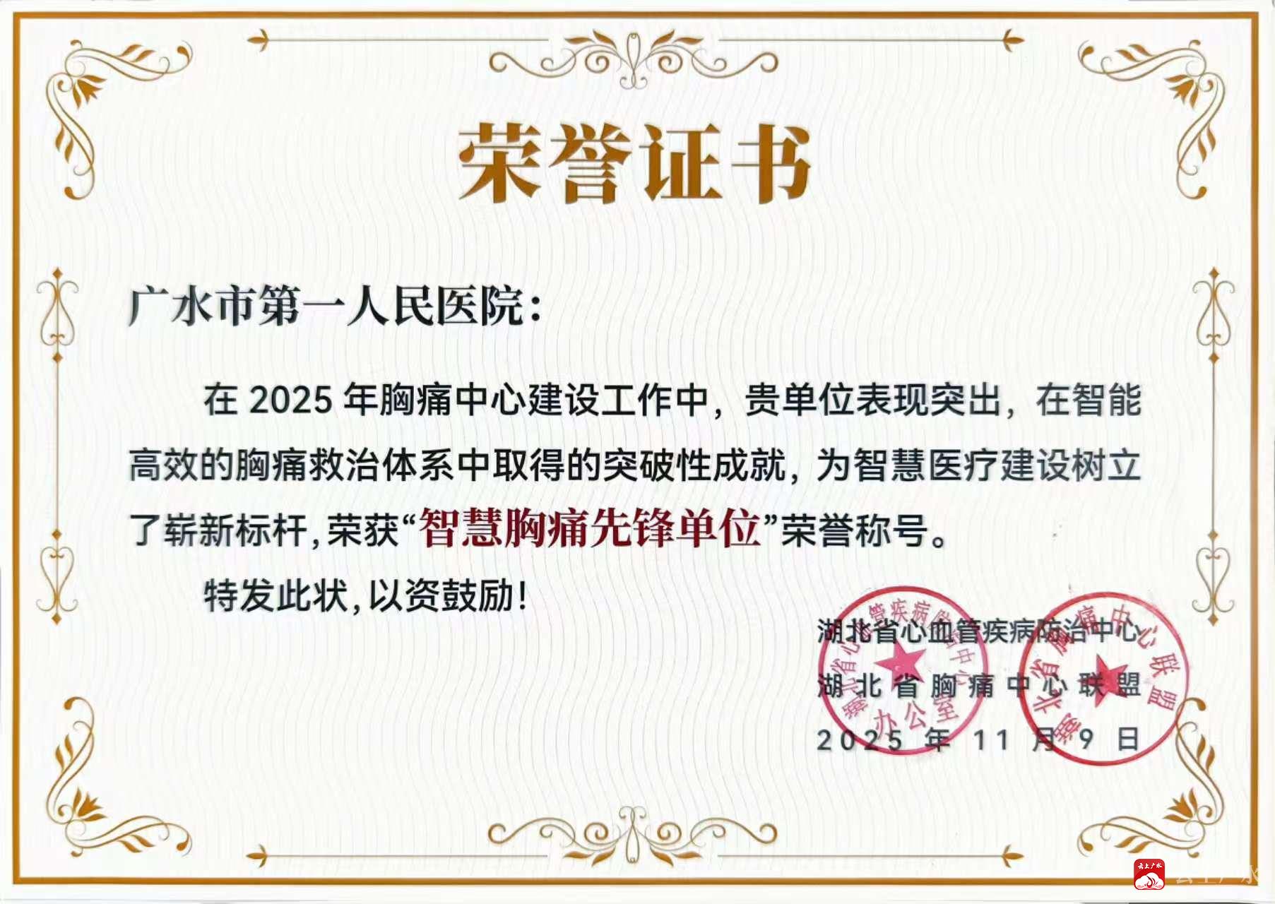 此次表彰旨在推动湖北省心血管疾病防治工作的深入发展,提升区域协同救治能力。广水一医院胸痛中心积极运用信息化手段优化胸痛患者救治流程,急诊人员在接到患者的第一时间,其心电图、生命体征等关键数据即可实时传输至院内专家手中,实现“患者未到,信息先到”,提前启动救治准备,为急性心肌梗死等危重患者赢得了宝贵的“黄金救治时间”,显著提高了急性胸痛患者的救治效率与成功率,获评“智慧胸痛先锋单位”。
