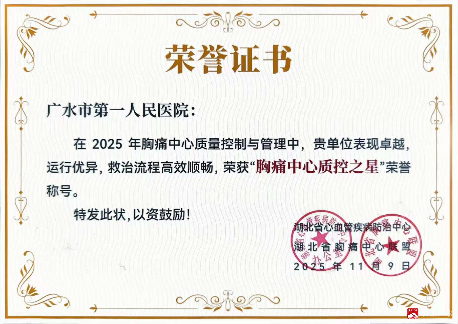 11月7日至9日,由湖北省心血管疾病防治中心与湖北省胸痛中心联盟联合主办的“2025心血管代谢与泛血管疾病多学科学术大会”在武汉圆满落幕。广水一医院胸痛中心荣获“智慧胸痛先锋单位”与“基层版胸痛中心质控之星”两项省级荣誉。