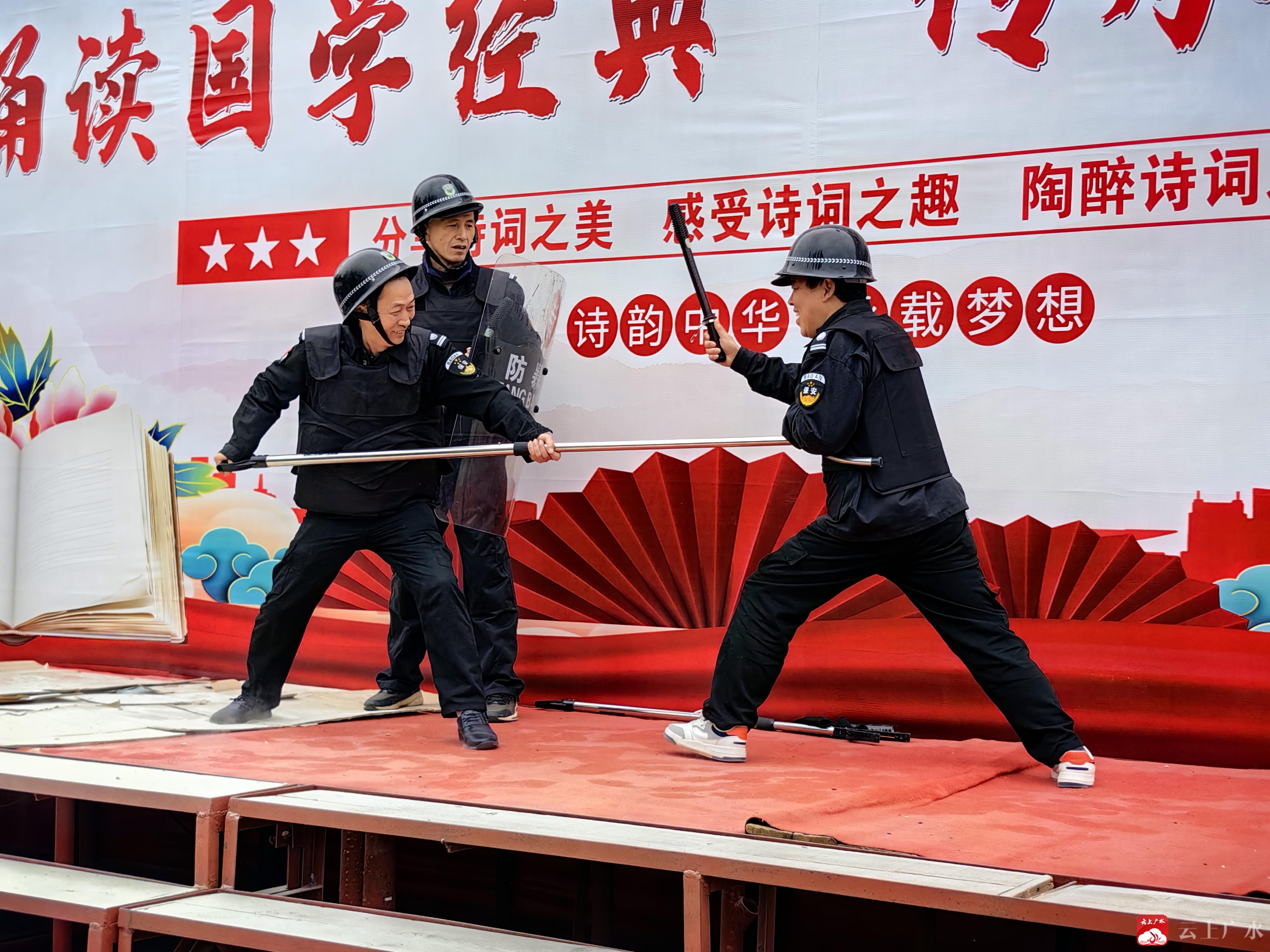 展示防卫技能,筑牢第一道屏障。本次活动的另一大亮点是面向全体学生的门卫防暴器械展示与演练。在学校综治办的指挥下,学校专职保安团队向师生们进行了一场专业、直观的防暴技能教学。门卫师傅们逐一展示并讲解了防暴钢叉、防暴盾牌、橡胶警棍等专用防卫器械的功能和使用要领,演示了如何利用器械进行有效阻拦、控制和自我保护。随后,通过模拟突发情景,保安队员们协作配合,现场演示了如何利用钢叉和盾牌迅速制服“不法分子”的战术动作。这场“寓教于演”的展示,不仅让同学们直观了解了校园安全屏障的坚固,也极大地增强了大家的安全感和对学校安保工作的信心。