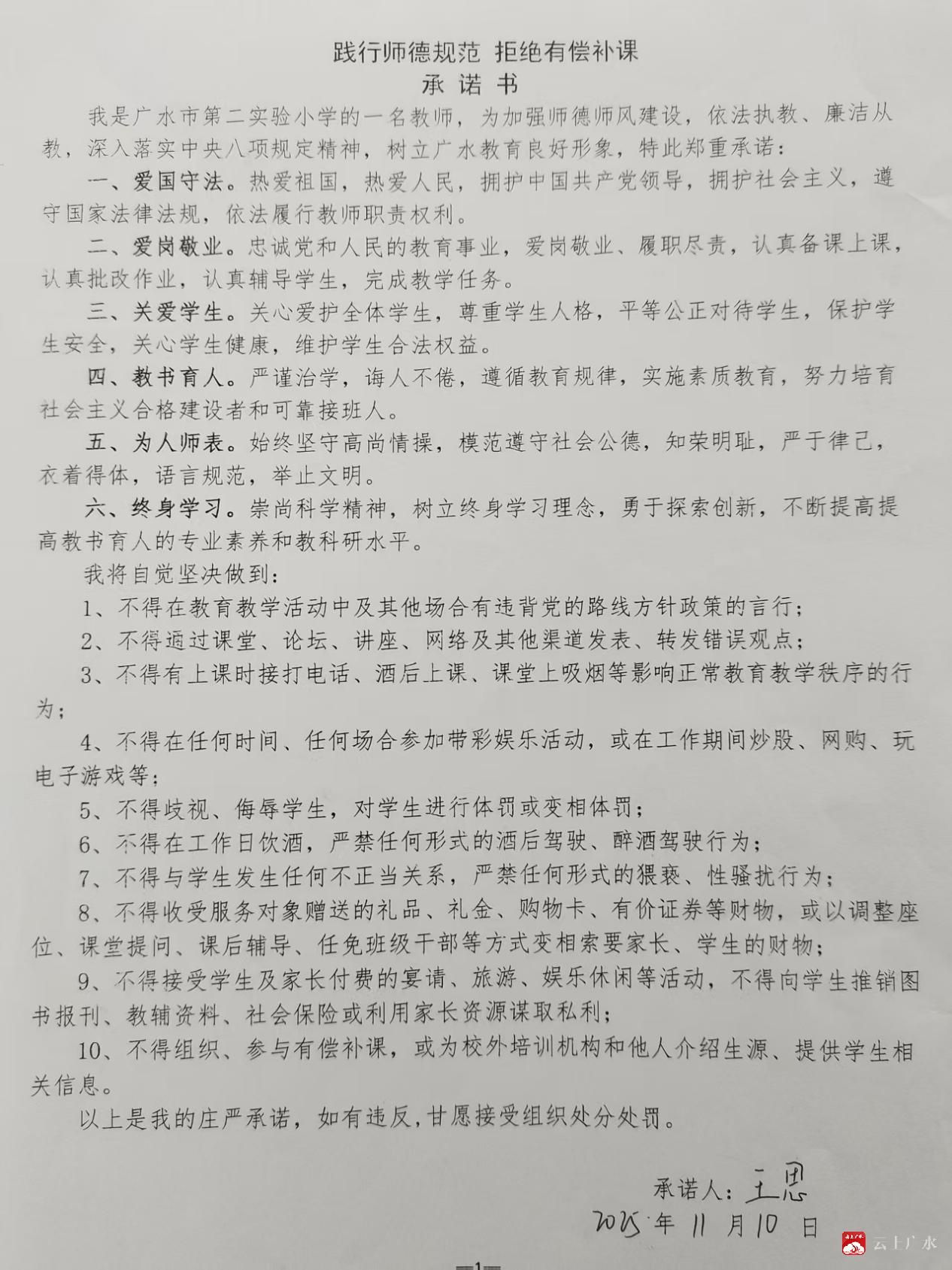 该校迅速召开全体教师会,传达市教育局新时代师德规范专题培训核心精神,组织学习《新时代中小学教师职业行为十项准则》。会议明确强调,全体教师必须严守师德底线,坚决杜绝体罚学生、有偿补课、带彩娱乐、酒驾醉驾等不良行为。以“学高为师,身正为范”的标准严格要求自己,争做学生成长路上的良师益友和榜样标杆。