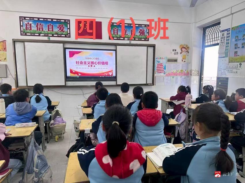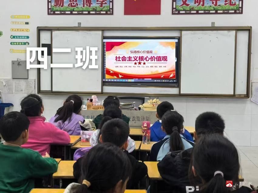 各班主任结合学生年龄特点与认知规律,精心设计了形式多样、贴近生活的教育环节,让抽象的价值理念变得生动可感。低年级班级通过动画短片、儿歌传唱、情景表演等形式,围绕“爱国、敬业、诚信、友善”等关键词,用孩子们易懂的语言讲解含义——比如通过“升国旗行队礼”的场景诠释“爱国”,用“认真完成作业”的事例解读“敬业”,以“不撒谎、守承诺”的小故事传递“诚信”,让学生在轻松互动中初步感知社会主义核心价值观的意义。中高年级班级则聚焦“富强、民主、文明、和谐、自由、平等、公正、法治”的价值导向,通过知识竞赛、主题辩论、案例分析、小组分享等形式,引导学生结合生活实际谈理解、实践行:有的同学分享了参与社区志愿服务的经历,诠释“友善”;有的同学讲述了遵守交通规则、爱护校园环境的做法,践行“文明”;还有的同学结合国家发展成就,畅谈对“富强”的感悟,表达了为祖国奋斗的决心。
