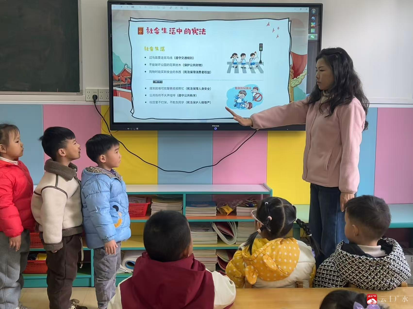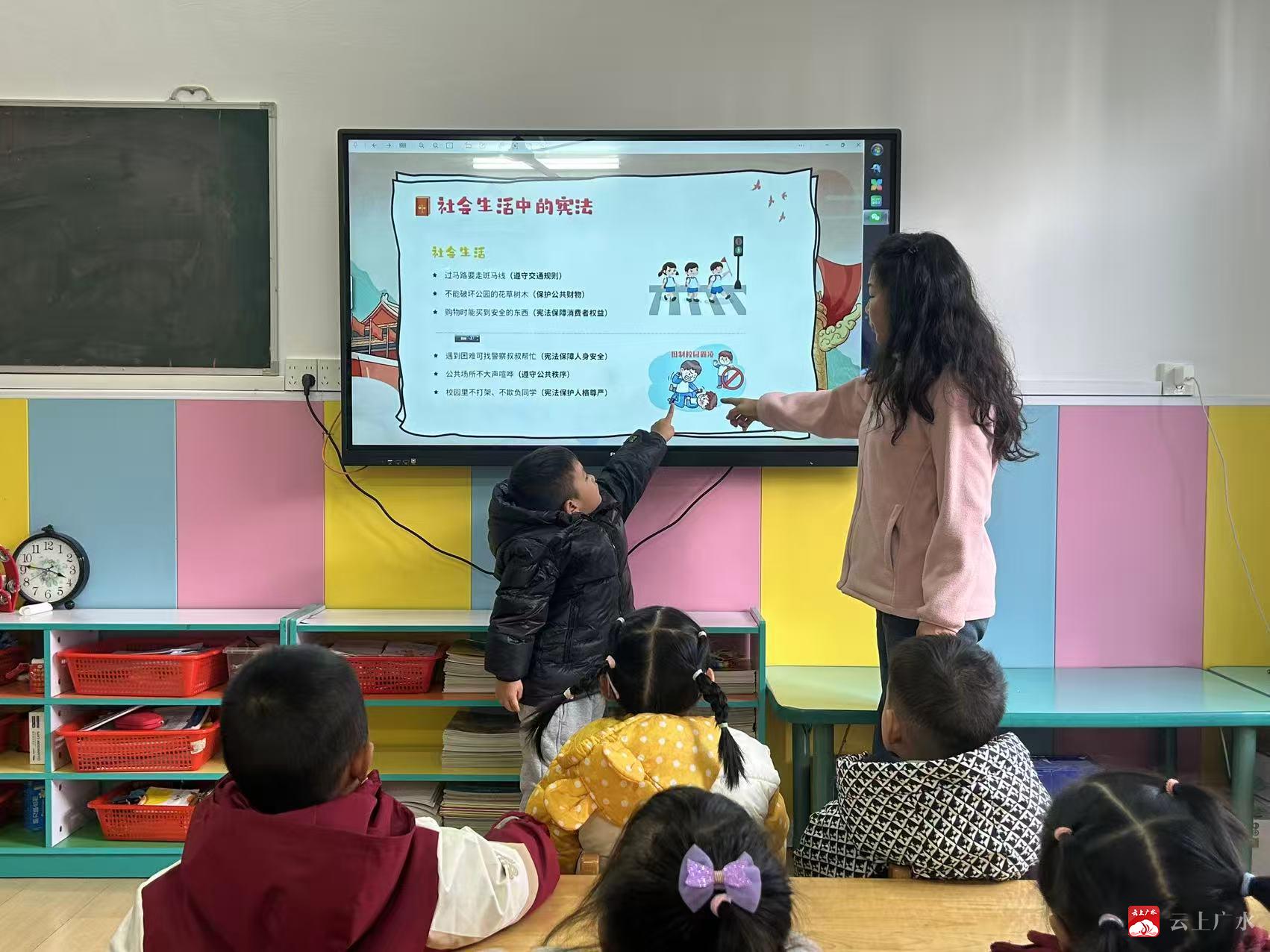 活动中,教师们结合幼儿的年龄特点,将抽象的宪法知识转化为具象的游戏与故事。通过《宪法是什么》绘本共读、“宪法小卫士”角色扮演、法治儿歌传唱等形式,用浅显易懂的语言向幼儿讲解“国旗、国歌、国徽”的含义,告诉孩子们遵守规则就是在践行宪法精神。