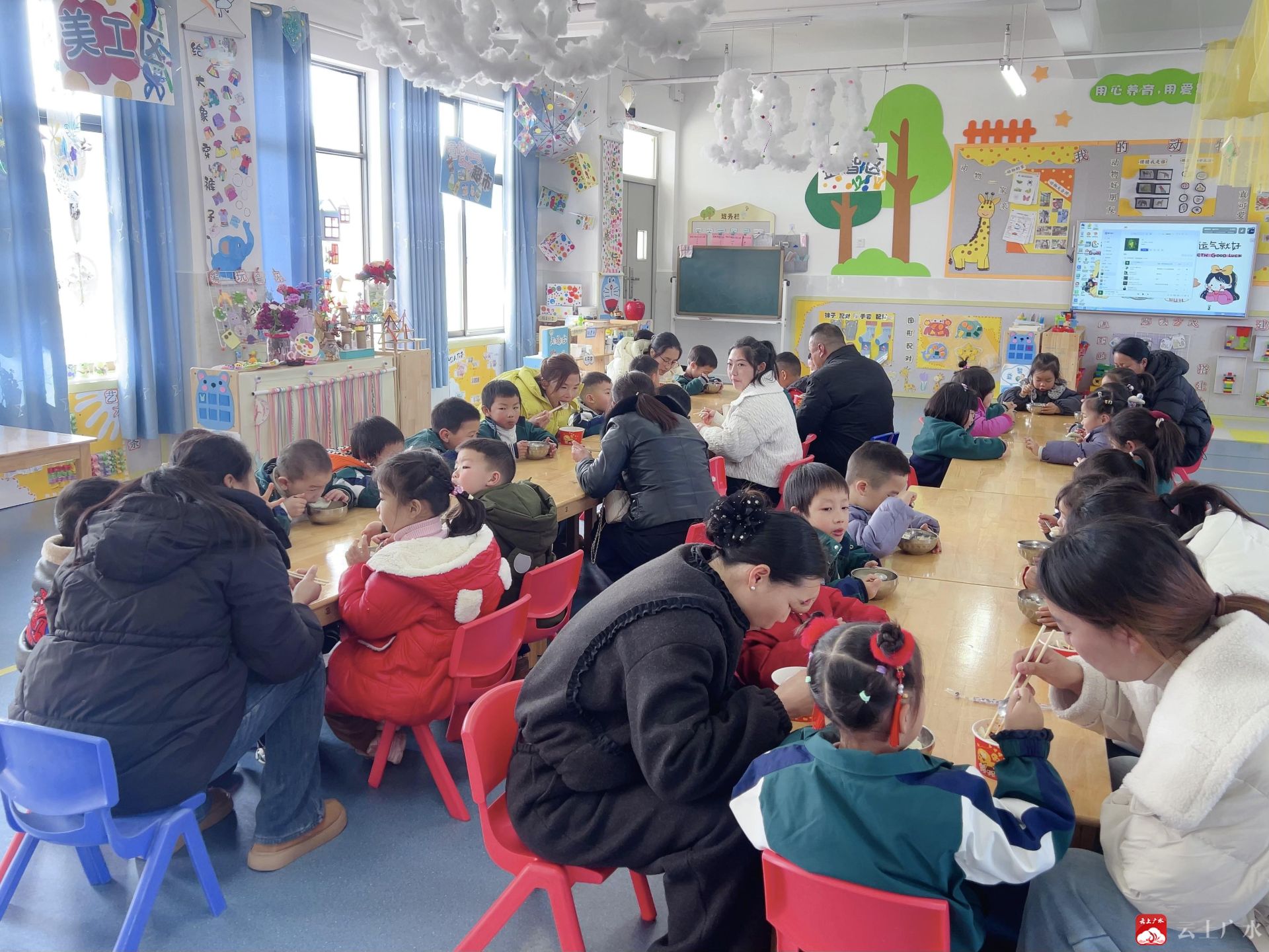 亲子共餐环节,孩子们和家长围坐在一起,品尝着共同制作的美食,分享着活动中的趣事。一张张笑脸洋溢着幸福,一声声交谈传递着温情,整个教室都弥漫着家一般的温馨氛围。
