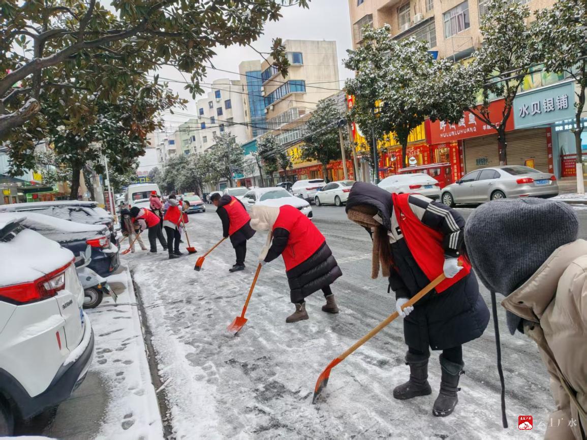 1月20日,应山街道胜利街社区在降雪后迅速组织工作人员、党员、居民志愿者,集中清扫社区主要人行道路、单元门口、坡道等位置的积雪,保障居民安全出行。