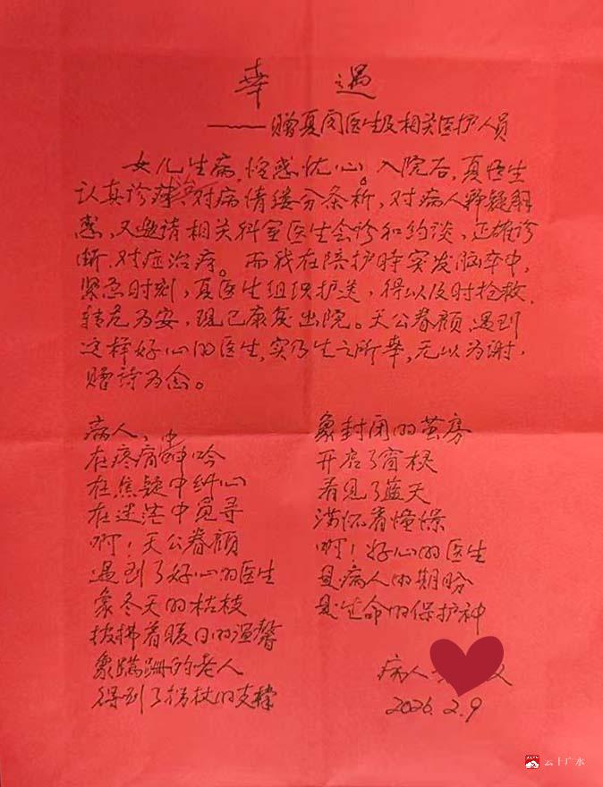 2月10日,广水市一医院肿瘤科一病区收到了一封“特殊”的感谢信——致谢人刘先生既是该科住院患者刘女士的父亲,也是一位在陪护期间突发脑梗、经该院医护人员全力救治而康复的急诊患者。这场始于病房内“多看一眼”的紧急救援,彰显了医者仁心与广水市一医院应急体系的效率。