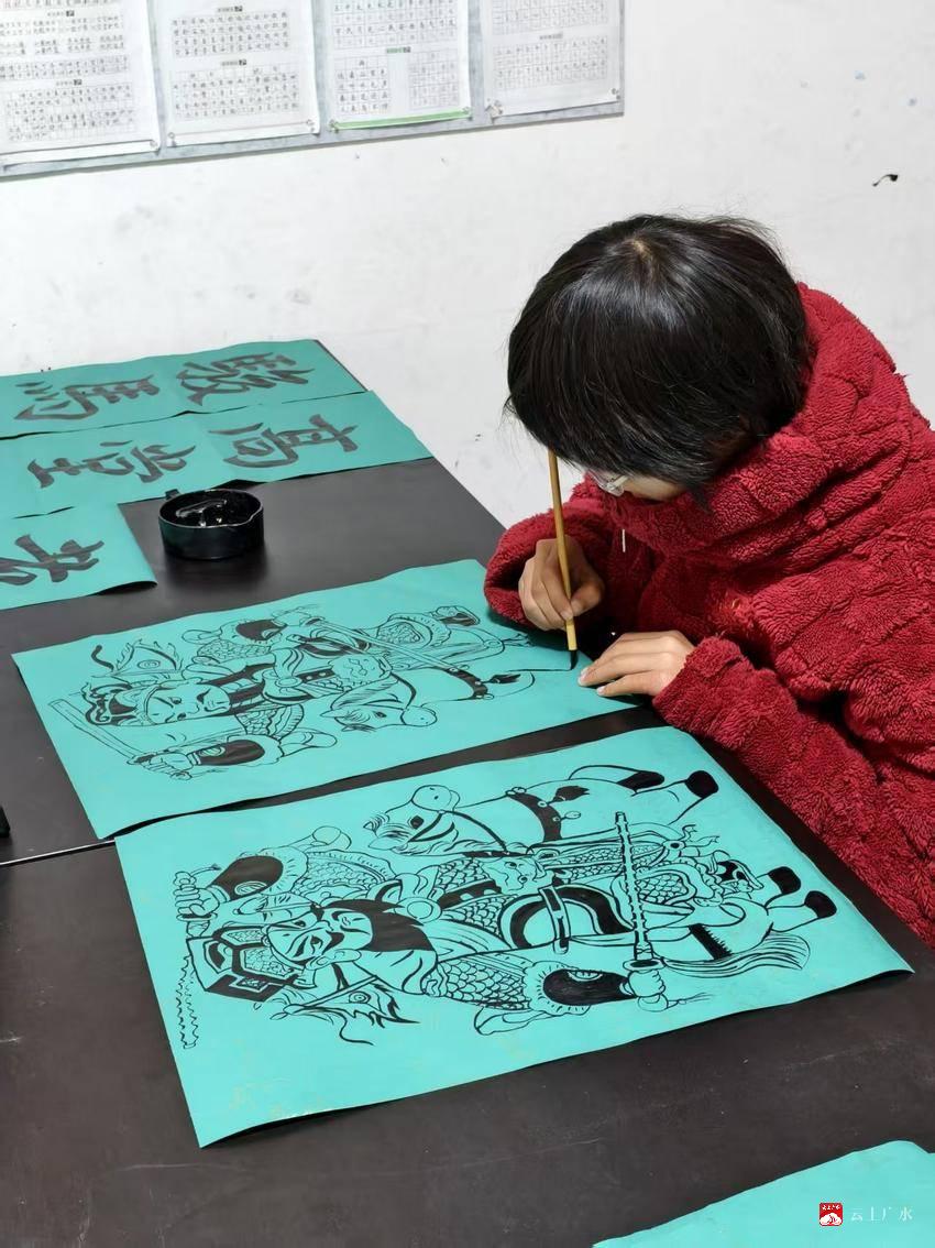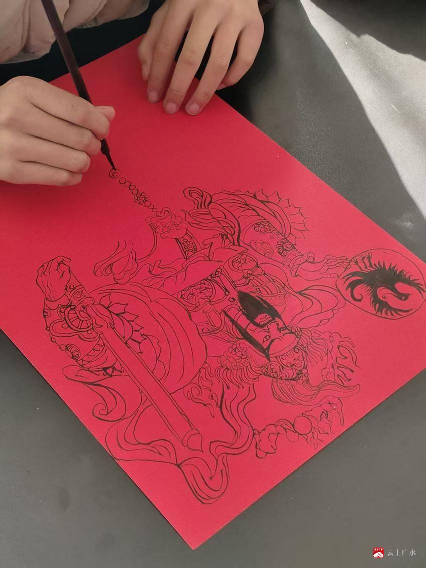 “我想要一副绿色的对联,再配一对门神,跑了好几家店都没买到。”一位街坊抱着试试看的心态来到蒋梦涵的摊位前。没想到,小姑娘当即铺纸研墨,现场书写对联一副,更凭借扎实的绘画功底手绘门神一对。传神的笔触、细腻的线条,加上这份贴心的定制服务,让居民喜出望外:“这才是过年该有的味道!手写的春联、手绘的门神,比买的更有温度!”