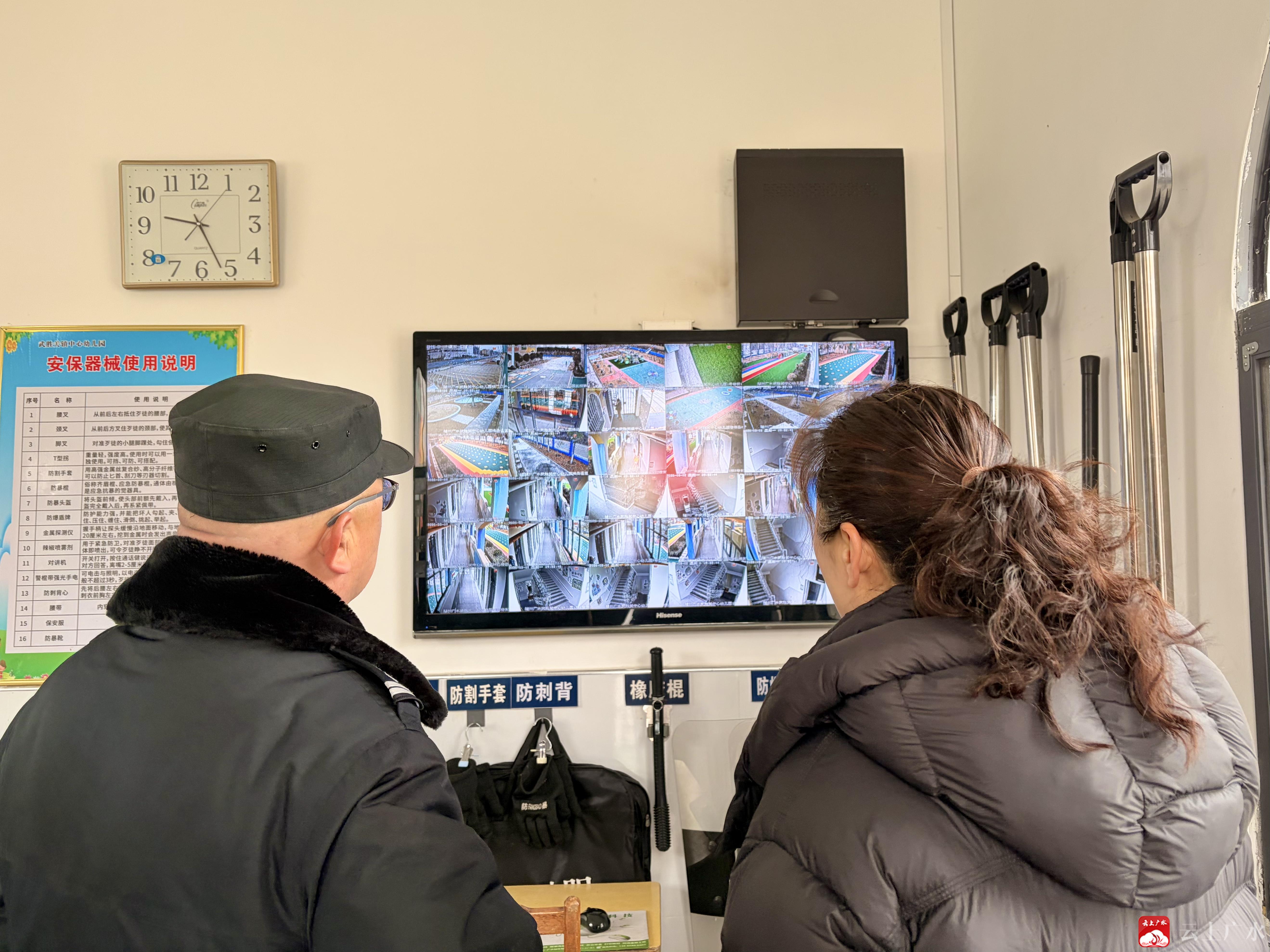 检查过程中,派出所民警与园长实地查看校园各个区域,逐一排查安全隐患。在食堂操作间,重点查看了消防设施配备情况,对厨房用电完善提出明确要求,确保师幼饮食安全。在教学楼走廊,仔细检查了消防栓等消防器材的完好性与有效性,强化应急处置能力。在安保室,通过监控系统全面了解校园视频监控覆盖范围与运行状况,对安保器械的配备、管理及使用情况进行核查,强调要严格落实门禁制度与值守要求。