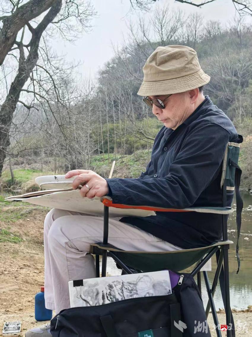 清晨的下店湾青瓦石屋错落其间,见证了这片土地的红色记忆。画家们或立于田埂,或坐于古树之下,用水墨、油彩、速写等方式记录鄂北古村的春日气息。