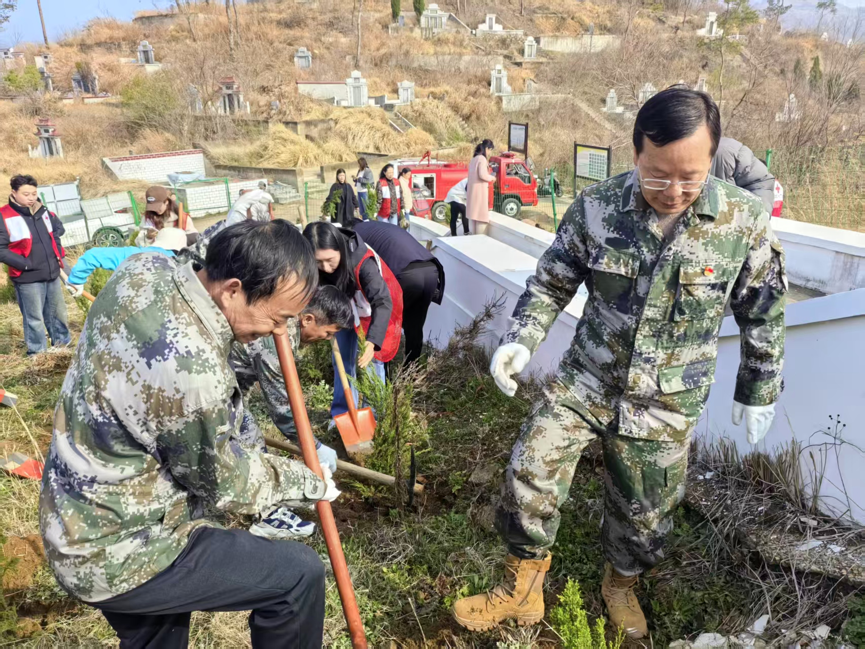 植树现场,退役军人志愿者充分发挥带头作用,他们与市纪委、社区干部群众分工协作、默契配合。挥锹铲土、扶苗填坑、提水浇灌……每一个环节都一丝不苟。一株株新栽种的翠柏迎风挺立,为烈士陵园增添了盎然生机,也寄托着对英烈的深切缅怀。