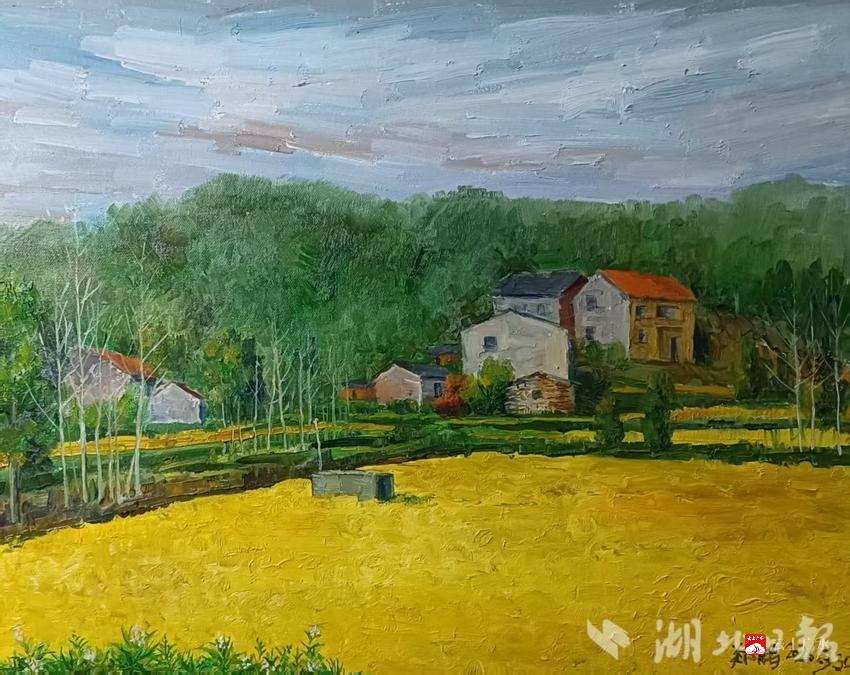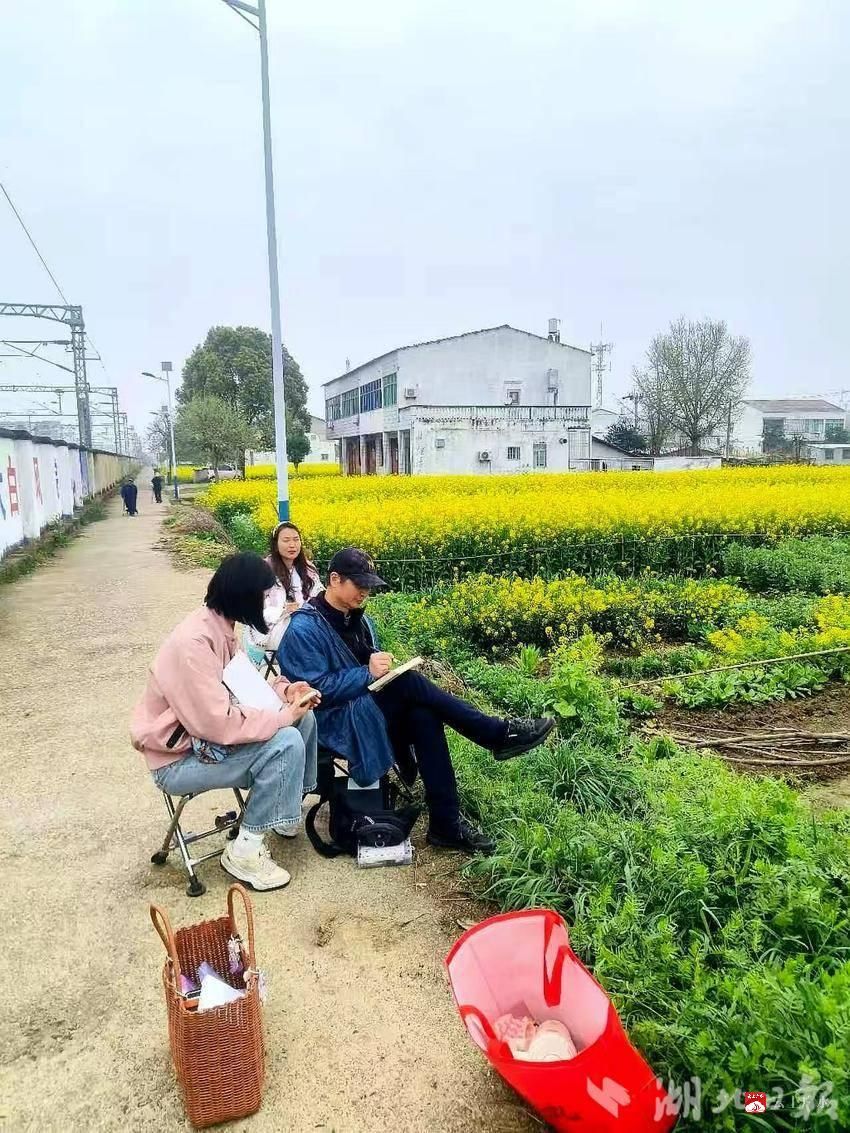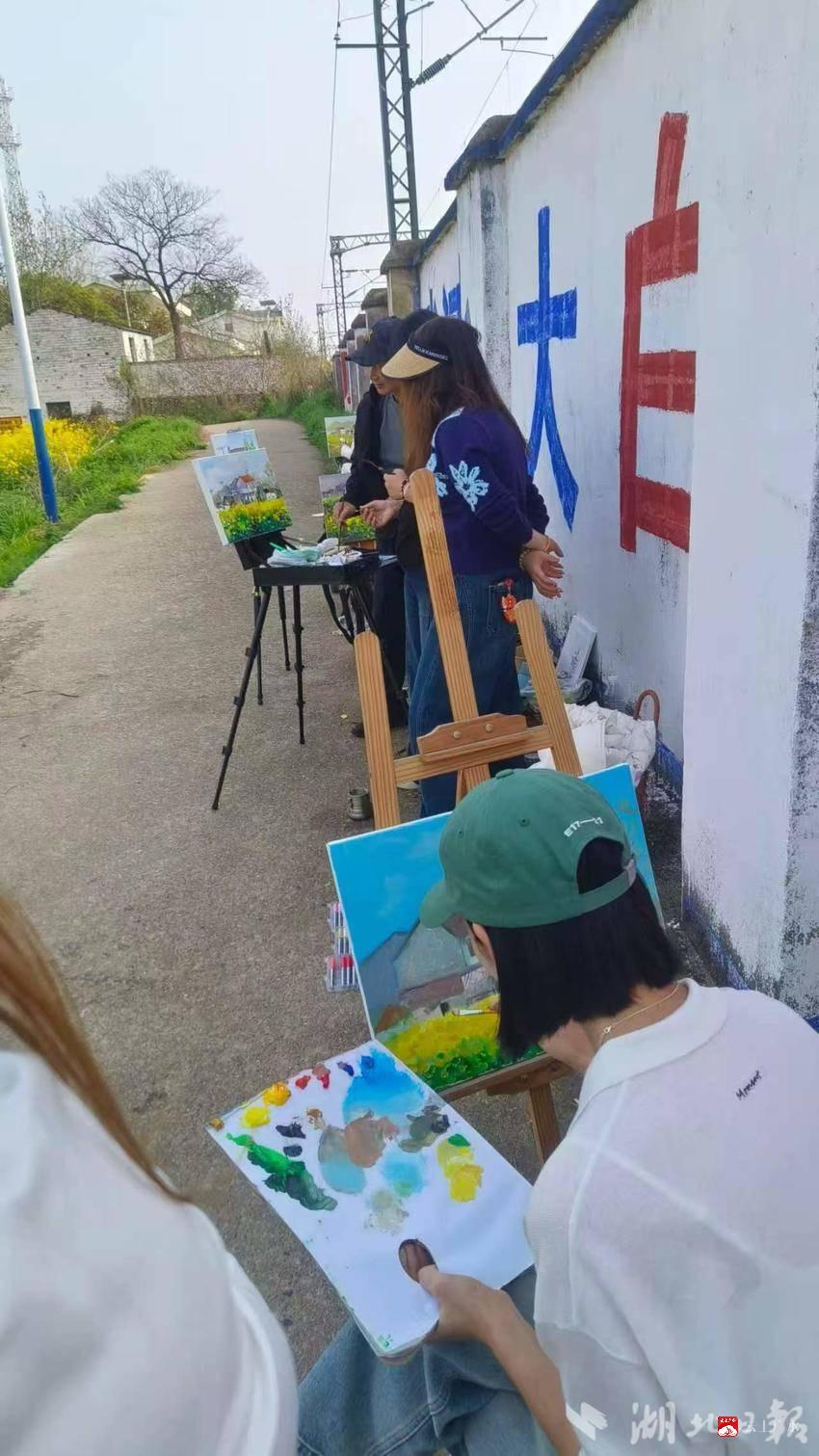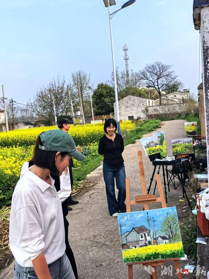 春日的魏家湾,草木葱茏,溪水潺潺。青瓦石屋掩映于绿树丛中,田野间油菜花正值盛放,金黄遍野,与远山、村落交相辉映,处处洋溢着生机盎然的田园气息。画家们一早就分散在村头巷尾,用油画、水彩、水墨等多种形式捕捉乡村的春日光影。金黄的花海成为画布上的主角,一幅幅充满泥土气息的乡村画卷徐徐展开。