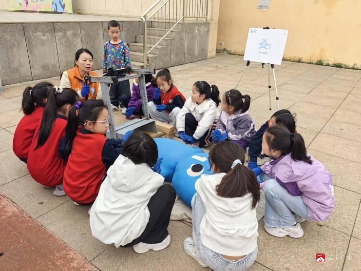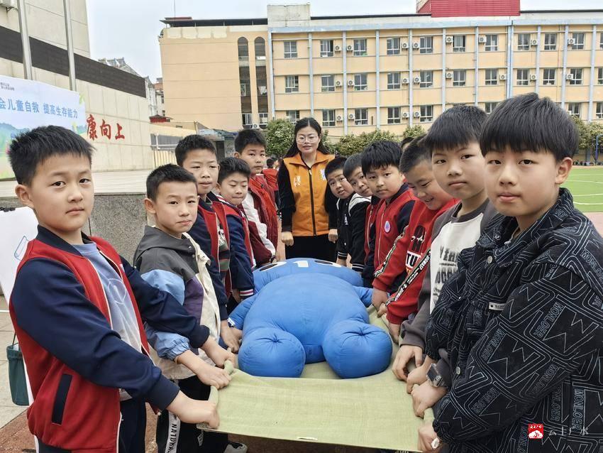 在学校操场上,孩子们亲身体验 “AED的使用方法、家具防倾倒、腹部冲击急救法、千斤顶抬升、绳结大比拼、毛毯担架计时赛”等实用救援技巧,义工讲师们为学生们详细讲解了每种急救技能的应用场景和操作要点,并进行规范示范,手把手指导每一个动作,温柔解答孩子们的疑惑,让他们在玩中学、在练中记,将自救互救的本领牢牢刻在心里。