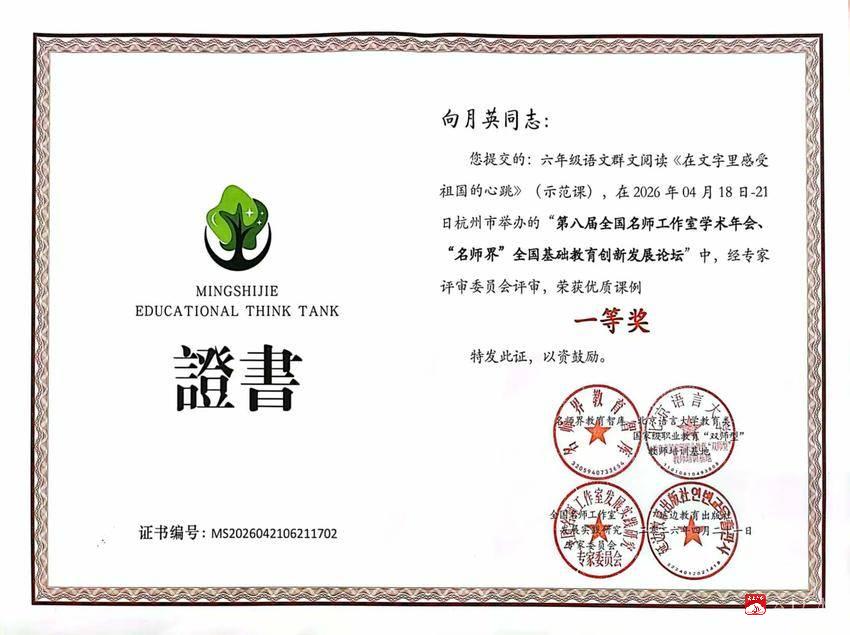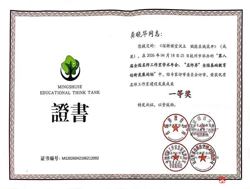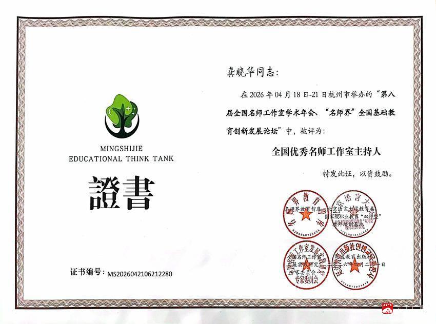 本次全国盛会中,龚晓华名师工作室成果丰硕、荣誉满满。工作室四名成员提交的参赛作品均荣获全国一等奖;工作室凭借扎实的教研积淀与突出的示范引领作用,成功获评“全国优秀名师工作室”;主持人龚晓华老师荣获“全国优秀名师工作室主持人”荣誉称号,多项重磅荣誉,充分彰显了工作室强劲的教研实力与团队风采。