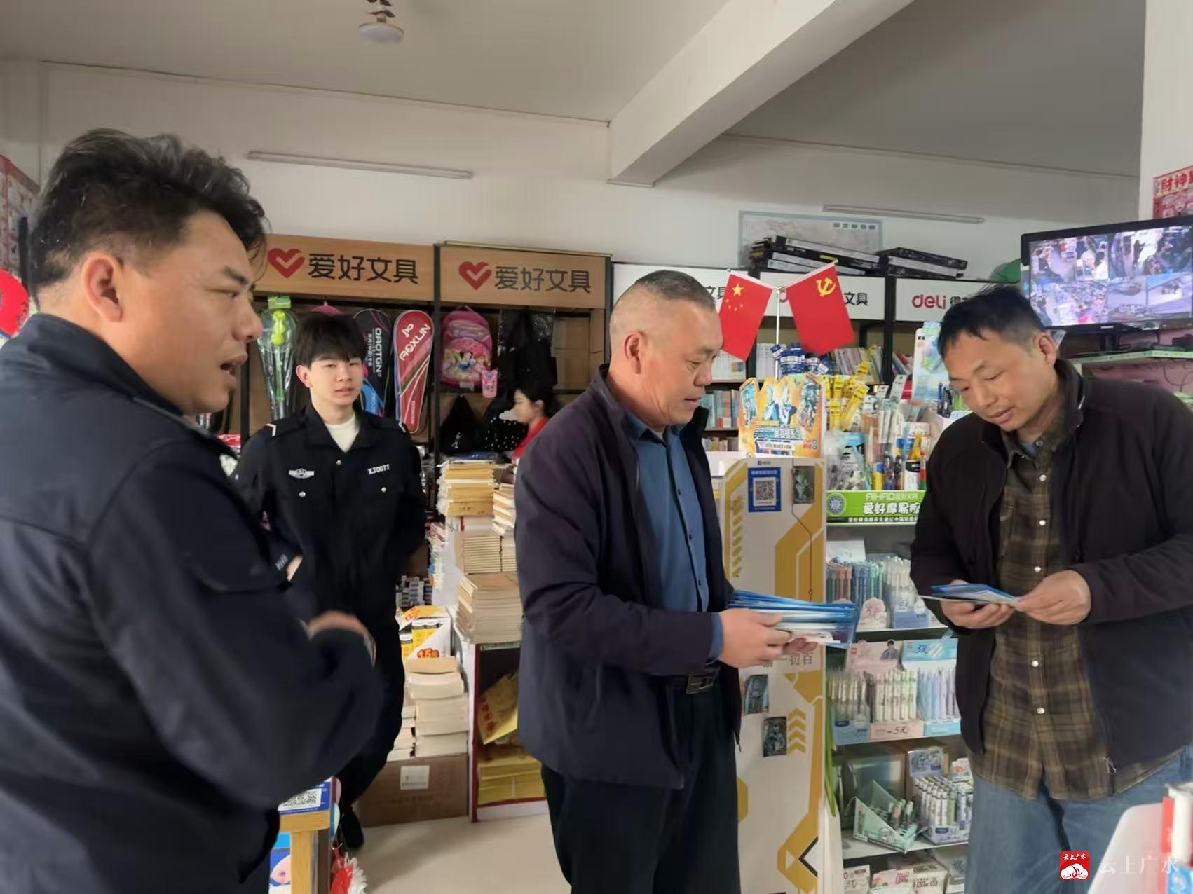 五一劳动节将至,为切实维护校园周边文化市场秩序,筑牢青少年健康成长防线,严防非法出版物、淫秽色情等不良文化产品侵蚀校园环境,4月28日,蔡河镇新时代文明实践所联合镇平安建设办、派出所等部门,聚焦学校周边书店、文具店、打印店等重点场所,集中开展“‘扫黄打非’·护苗”主题宣传整治活动,为辖区青少年营造文明、健康、安全的节日文化环境。